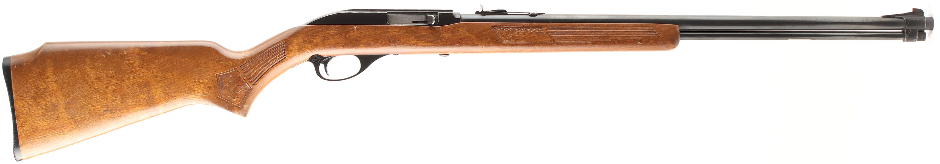 Marlin, Model Glenfield 60, CAL: 22LR, MFG: 1971, SN: 71430534, Semi Auto Rifle, 22'' barrel. The original flat pistol grip Monte Carlo stock is excellent, with a few minor handling marks to the original finish. The wood features pressed squirrel, oak leaves & stripe accents. The original metal blue finishes rates 85% overall. Bore is excellent & bright. The receiver previously had a scope mounted, while the barrel carries an adjustable rear & ramped blade front sights. Stock carries a checkered plastic buttplate. 14 rnd tube mag. Very nice overall. FFL or C&R Req. - Value: 150 to 300