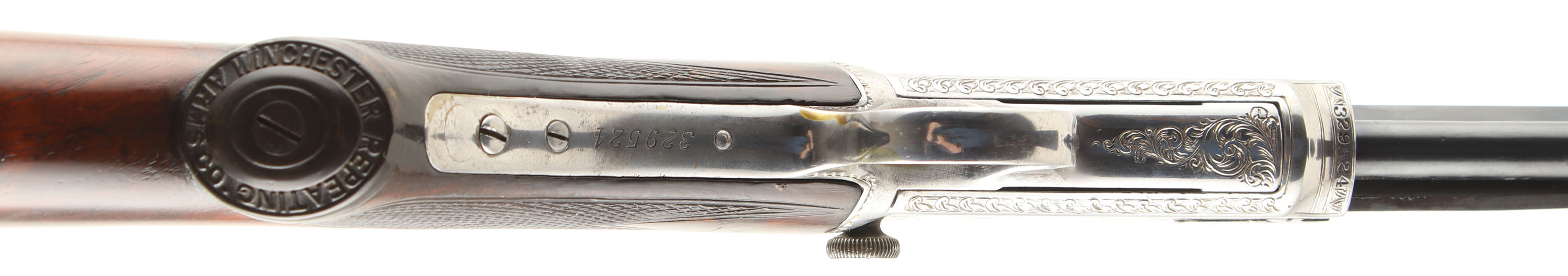 FANTASTIC NICKEL ENGRAVED Winchester, Model 1890 2nd model, .22 WRF Cal., MFG. 1907, SN: 329524, Pump Action Rifle, 24'' Tapered Octagon barrel, The receiver, barrel & trigger guard are elaborately scroll engraved, with forest scenes depicting two squirrels on the left side of the receiver & three rabbits on the right side. This engraving is as shown on pg. 125 of ''Winchester - An American Legend'' by R. L. Wilson as being Winchesters No. 8 style, ''Especially suitable for rifles having small frames, such as the Model 1890 & the Single Shot''. Band & small scroll engraving is displayed on all flats of the barrel, with additional 1'' scroll on four side flats & 2'' of scrolls on the top flat beyond the caliber marking. Neither the top of the receiver or the barrel are proof stamped as you would expect on a factory engraved rifle. The deluxe original capped pistol gripped walnut stock has Winchester' fancy ''H'' style hand checkering. The stock exhibits fantastic grain. There is a dowel sized repair (restoration), one on each side of the wrist, where a pin through the wrist once resided for known reason. Does not appear that it was necessary for stability, as the wrist is structurally sound. However, there is a small 1'' tight stress crack off the left side of the upper tang & running downward into the checkering on the wrist. The stock appears to carry an added layer of finish, likely added at the time of the wrist restoration. The corncob forearm & its finish appear original with use thinning of the finish & darkening at areas of finish loss. Overall, the socks present very well. The metal blue finish appears to have been restored, rating 90% on the barrel & mag tube, with some spotting, speckling or light pitting in areas. The nickel on the receiver rates excellent, with some thinning on the sides & inside the trigger guard. Bore is excellent. Factory front & rear sights. The left side of the lower tang under the wood is stamp ''3925X'', the ''X'' marking it as a deluxe wood rifle. The ''3925'' is also stamped on the buttend of the wood stock & on the inside of the buttplate. These numbers are the first four digits of the SN, but oddly stamped ''3925'' rather than the ''3295'' of the actual SN. There is some question to whether this rifle was factory engraved or the professional Custom engraving of a factory deluxe rifle. It is honestly very difficult to determine from simple examination. The engravings & stampings are sharp as you'd expect from the factory. If it is custom engraving outside the factory, the current blue would have been done after the engraving. Without the proof a factory standard or deluxe rifle, one would infer that the receiver was pulled from standard production before proof stamping for factory custom shop engraving. Regardless, it is truly a wonderful nickeled engraved 1890 rifle, that presents very sharply & is in excellent condition. FFL or C&R Req. - Value: 5000 to 8000