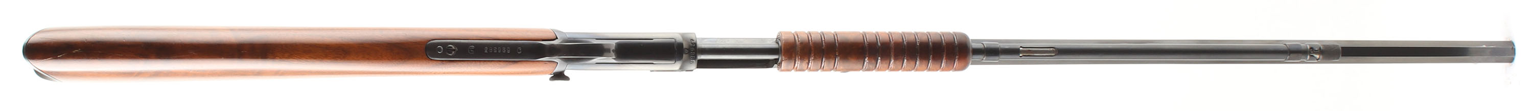 Winchester, Model 90, .22 LONG R. Cal., MFG: 1919 SN: 626385, Slide Action Pump, 24'' Tapered octagon barrel. This Rifle has been fully restored. The L.R, only caliber is the rarest & most desired caliber amongst collectors as only 10% of total production was this caliber. The L.R. caliber was added in the mod 90 line-up in 1919 making this a 1st year rifle with this caliber. The original wood stocks are excellent, as lightly sanded & expertly refinished. There are very few tiny handling marks to the excellent finish. The restored metal blue finish rates 95% overall. Bore is fair, with cleaned roughness & a ring in the thin rifling mid barrel, no bulge. Barrel carries an adjustable rear & blade front sights. Factory crescent steel buttplate. A sharp example of a restored single caliber mod 90. FFL or C&R Req. - Value: 800 to 1200