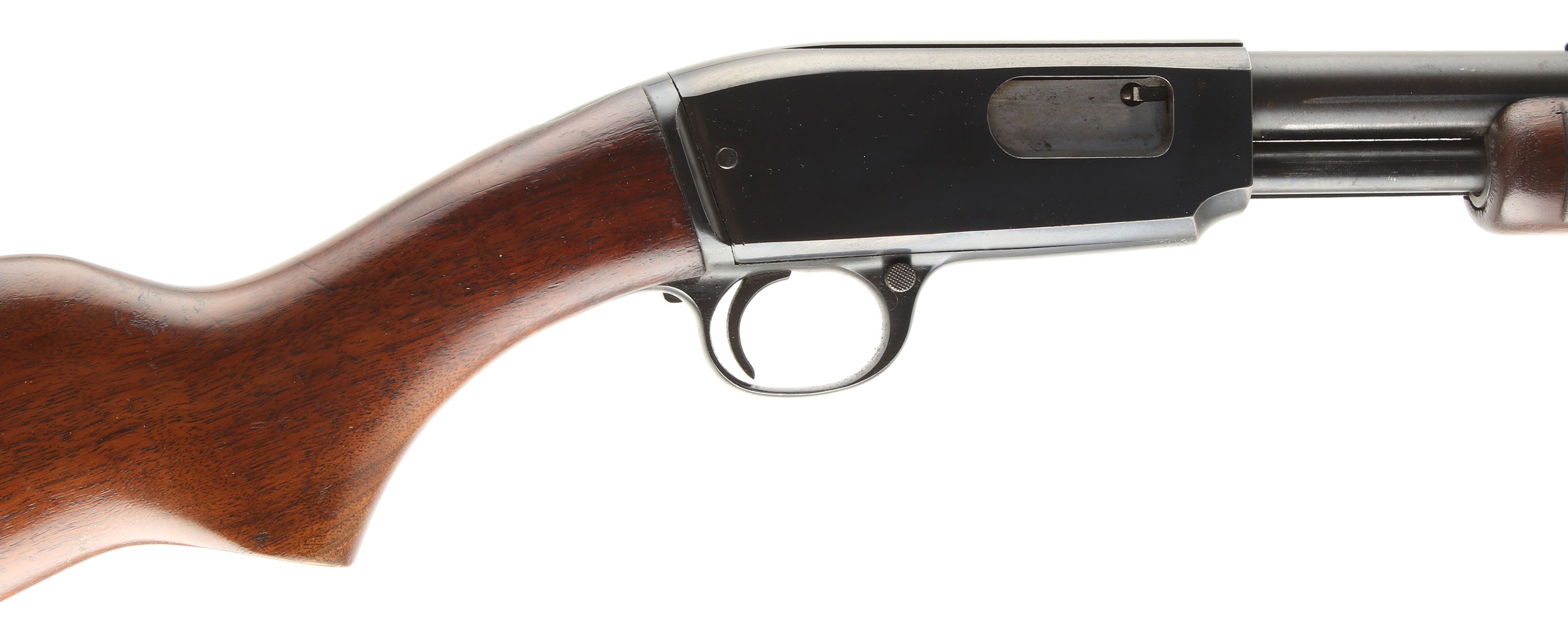 Winchester, Model 61, Marked .22 WIN. MAG. R.F., MFG. 1960, SN: 301054, Pump Action Rifle, 24'' round barrel, Grooved receiver. Desirable single caliber marking, with .22 Win Mag being the most desirable in the round barrels. The original flat pistol grip wood stocks are excellent, with a few minor scrapes, scratches & contusions to the original finish. The metal blue finish rates 90% overall. Toning a bit gray on the barrel as it thins & some speckling on the receiver. Bore is excellent & bright. The barrel carries an adjustable rear & elongated blade front sights. Factory checkered plastic buttplate. A very nice original example & collectible Win Mag caliber. FFL or C&R Req - Value: 800 to 1200