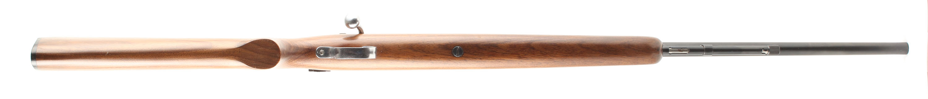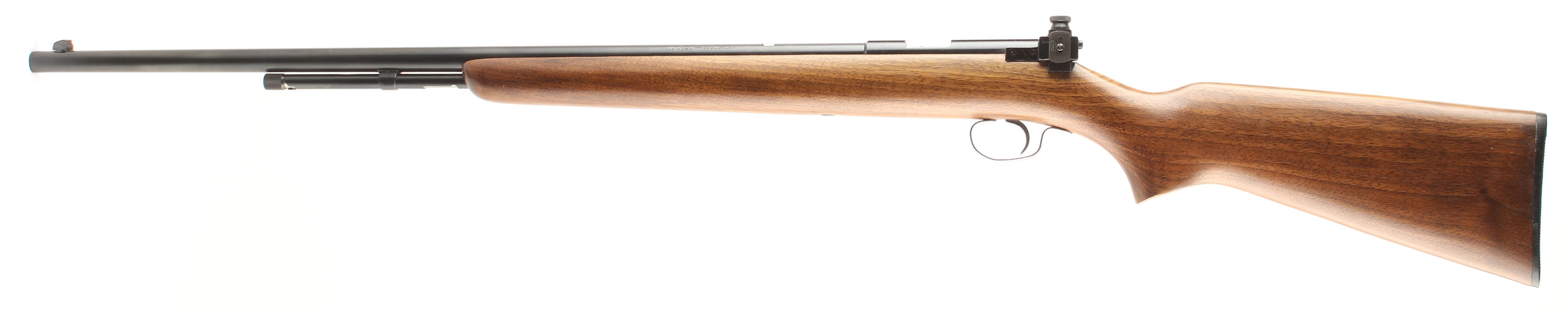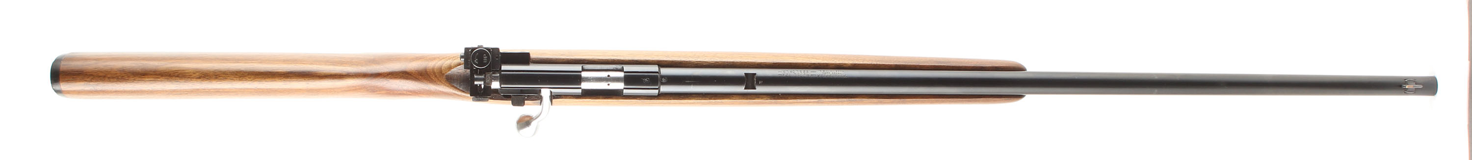 Winchester, Model 72A, .22 S, L, LR Cal., MFG. 1938-59, SN: None, Bolt Action Tube Fed Rifle, 25'' round barrel. The factory flat pistol grip wood stock is excellent, with very few tiny handling marks to the excellent original finish. The factory metal blue finish rates 98% overall. Bore is excellent, The rifle carries a side mounted receiver sight, while the barrel has an open rear dovetail & standard front sight. Original black plastic buttplate. Nickeled bolt, bolt handle, trigger & trigger guard. Excellent overall. FFL or C&R Req. - Value: 300 to 600