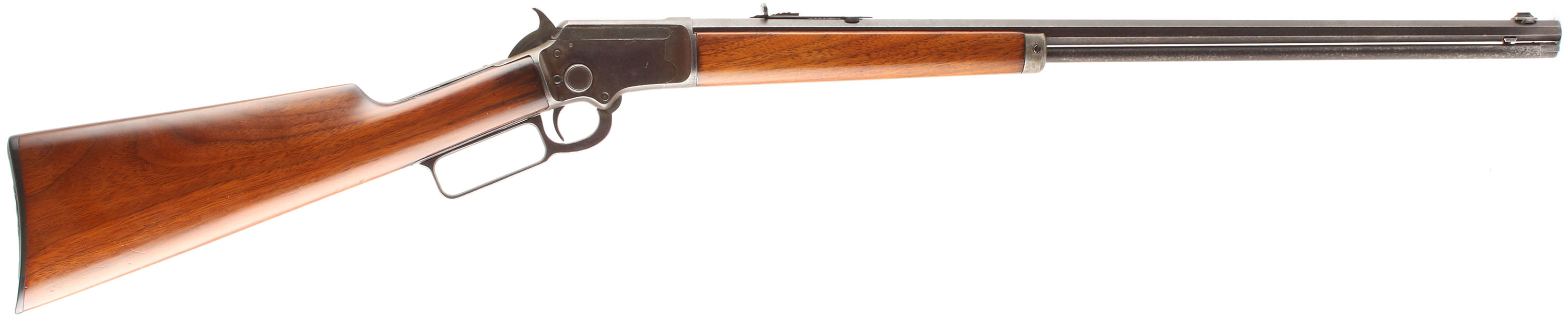 Marlin, Model 97, .22 S. L. LR Cal., MFG. 1910, SN: 411804, Lever Action Rifle, 24'' Octagon barrel, The original wood stocks are very good, as having been sanded & nicely refinished. There are several minor contusions, scraps & scuffs to the very nice high gloss finish. The metal sits proud to the wood along the edges of the tangs & receiver. The metal on the barrel & tube has worn mostly gun metal gray, with a thin spotty brown patina. The case-hardened receiver & lever has also faded to gun metal gray, with a thin brown patina, Bore is very good. The barrel carries an adjustable rear & low profile blade front sights. The stock carries a Marlin checkered plastic buttplate. Tight smooth action. FFL or C&R Req. - Value: 400 to 800