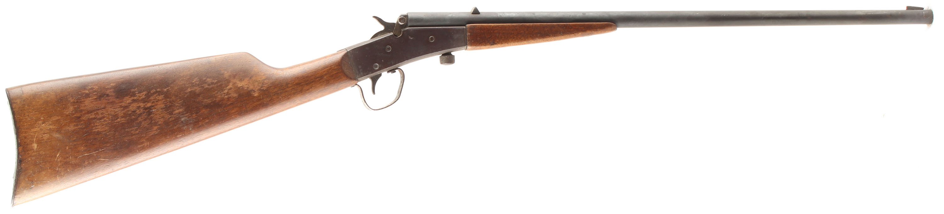 J. Stevens Arms Co. Model ''Little Scout No.14 1/2'', 22 LONG RIFLE, MFG: 1906-10, SN: N/A, Falling Block, Single Shot Rifle, 20'' round barrel. The original wood stocks are very good & solid, with several minor contusions, scrapes & flaking to the original finish. The metal finish on the barrel & receiver is an applied finish, with the barrel having a spotty gray/black coloring, while the receiver is mostly chocolate brown. Bore is good & bright, with thinned rifling. The gun is fitted with fixed rear sight & blade front sight. Metal buttplate. FFL or C&R Req. - Value: 50 to 150