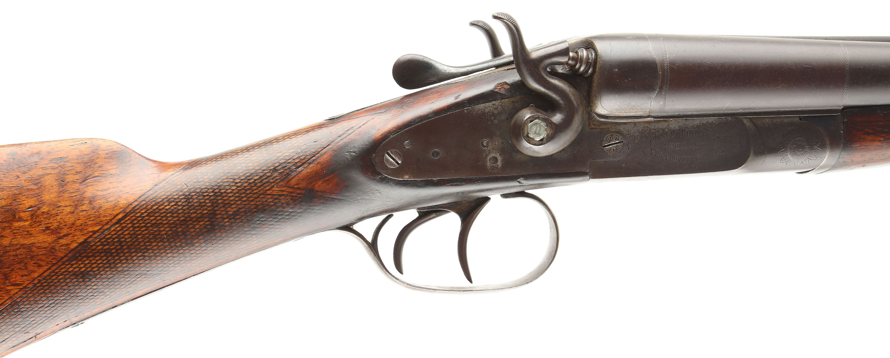 Fuile Rinforzato Hammer Double CAL; 12GA, MFG: N/A, SN: 95679, Break Action SxS, Choke: Full/Full, 27 1/2'' barrel. The side plates are marked with the makers name, the bottom of the receiver is marked ''MONOBLO BERETTA/BRESCIA'' & the barrel is marked ''P.BERETTA GARDONE V.T BRESCIA''. The original checkered straight grip stocks are very good & solid, having been sanded & refinished. There are numerous contusions, dings, scratches & scrapes throughout. The blued finish on the barrels has full toned to smooth brown patina. The nickeled receiver & side plates have remnants of nickel finish in heavily protected areas, but mostly worn to metal gray & toned to a brown patina. Bores are poor, bright, but heavily pitted. The Solid matted rib holds a front bead. Stock has a Beretta grooved metal buttplate. Sling loops. Double triggers. FFL or C&R Req. - Value: 200 to 400