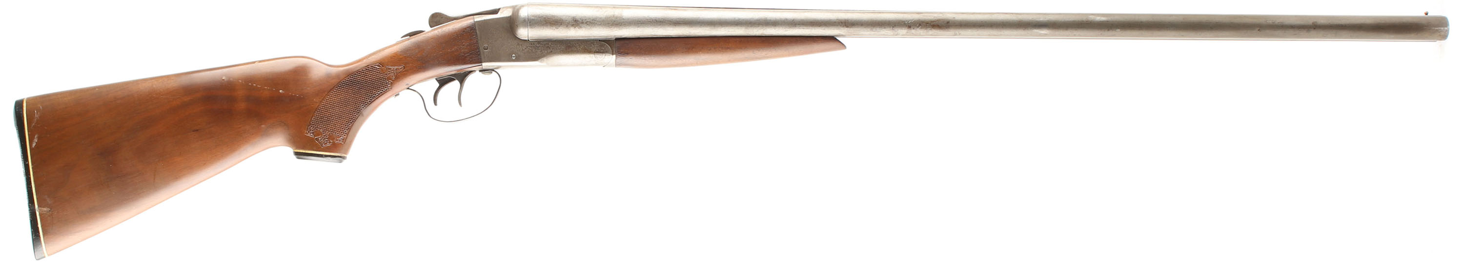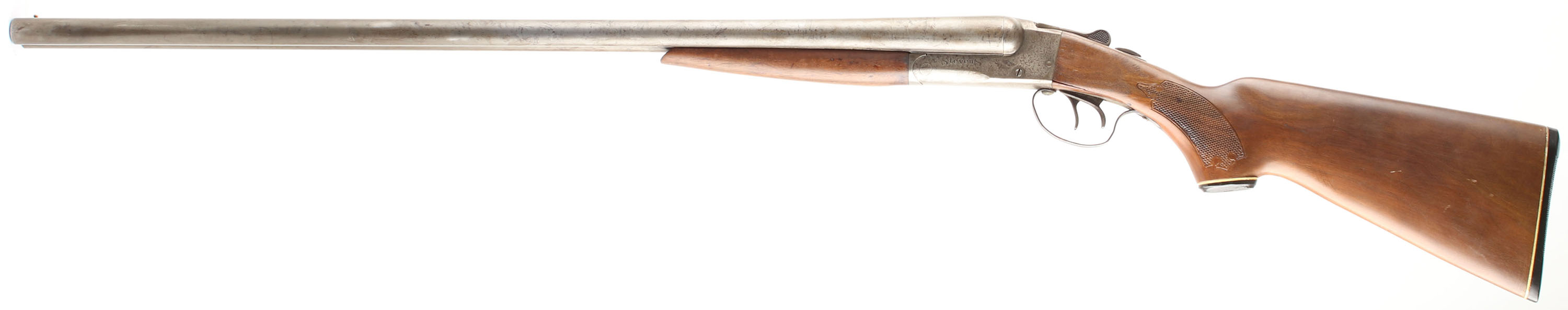 J. Stevens Arms Company, Model 330, CAL: 12GA, MFG: 1923-36, SN: H12657, Break Action SxS Shotgun, Choke: IM/M, 30'' barrels. Factory markings on receiver. The original checkered capped pistol grip stocks are good. There are multiple large cracks coming off the back of the receiver & tang, a large area of filler on the left side of the upper tang & the stock is separated from the lower tang on the left side. The forend has been sanded & refinished, with smoothed dings & scrapes. The blued finish on the barrel & receiver has fully worn to metal gray with spotty areas toned to a brown patina. There is some scarring on the outside of the barrels. Bores are excellent, with visible striations. The solid grooved rib holds a single front bead. Stock has a grooved plastic buttplate. Double triggers. FFL or C&R Req. - Value: 100 to 250