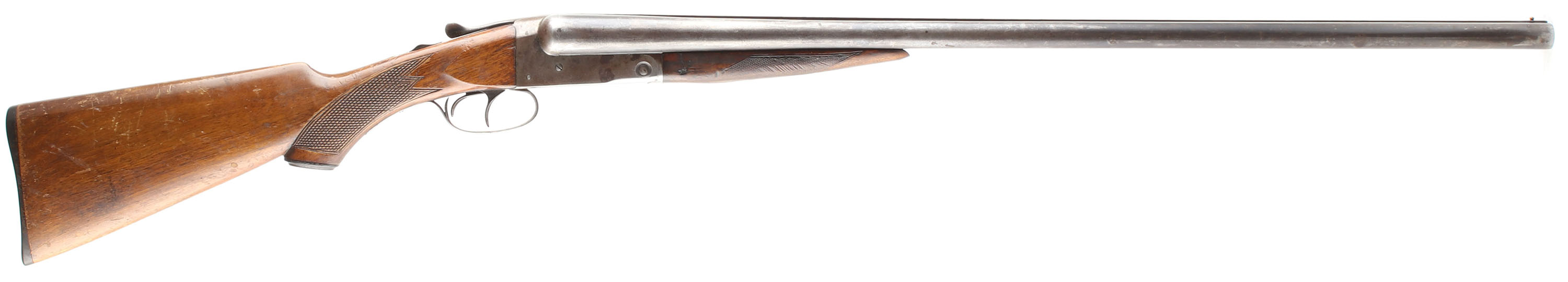 J. Stevens Arms & Tool Co., Model 355, CAL; 12GA, MFG: 1907-16, SN: 5706, Break Action SxS, 30'' barrels. The checkered, capped pistol grip stocks are very good & solid. There are surface level scrapes, scratches, dings & areas of flaking/thinning finish. The forend has been sanded & refinished, with smoothed contusions, dings & scrapes. The original blued finish on the barrel has worn to a mix of metal gray, brown patina & remaining blue. The case-hardened frame retains a few visible area of case-color, but mostly worn to metal gray & toned to a brown patina. Bores are very good & bright, with striations from use. The solid matted rib holds a single front bead. Stock has a factory Stevens checkered plastic buttplate. Back trigger does not fire. We recommend this shotgun be inspected by a licensed gunsmith before use. SOLD AS IS NO RETURNS. FFL or C&R Req. - Value: 100 to 250