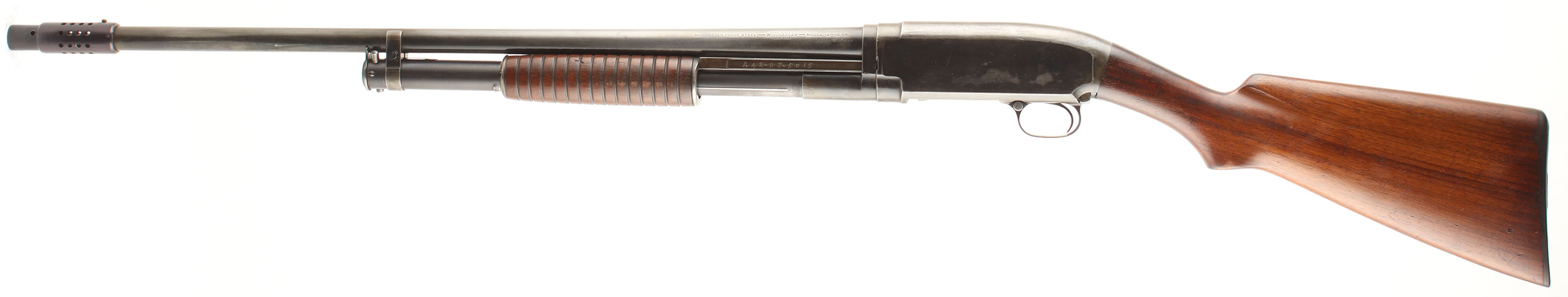 Winchester, Model 12, CAL: 16GA, MFG: 1928, SN: 624577, Pump Action Shotgun, Choke: Full, 2 3/4'' chamber, 24 1/4'' barrel. The original flat pistol grip stocks are very good & solid. There area few small grain cracks around the wrist, coming off the tangs, with surface level scrapes & dings to the finish. Protective oils have been applied over time. The blued finish rates 30% on the barrel, 50% on the receiver & 50% on the mag tube. A SSN is scratched into the right side of the receiver & left slide bar. Bore is excellent. The Weaver Choke system carries a bead sight. Stock has Winchester checkered plastic buttplate. FFL or C&R Req. - Value: 200 to 400