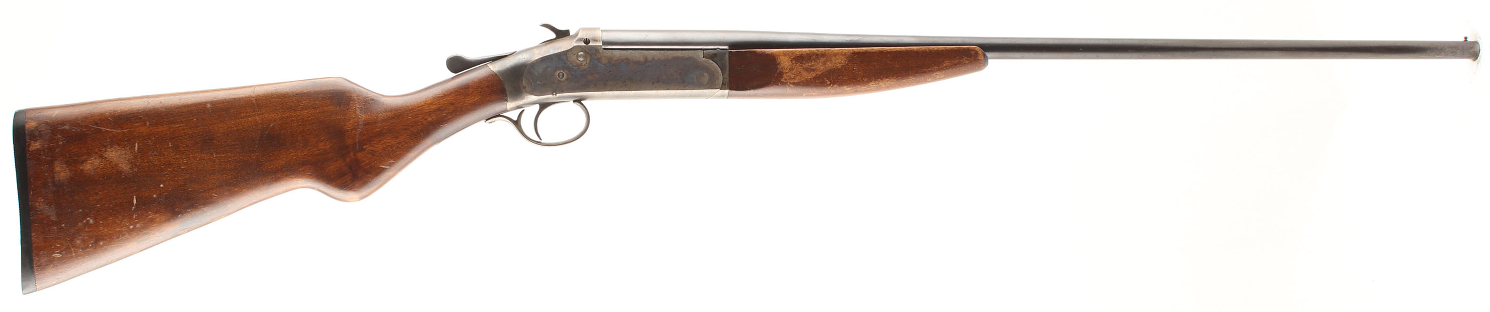 Montgomery Wards, Excel, CAL: 410, MFG: N/A, SN: 97556XF, Break Action Single Shot Shotgun, 26'' barrel. The original round knob stock is very good. There are minor scrapes, dings, nicks & areas of thinning to the original finish. The blued barrel has 40% coverage, with even thinning toned to a brown patina & a small area worn to metal gray at the muzzle. The case-hardened receiver retains visible case-colors, with areas worn to metal gray & toned to a brown patina, with spotting throughout. Bore is excellent. The barrel holds a single front bead. Stock has a grooved plastic buttplate. Mechanical operation appears to function properly. A good shooter .410. FFL or C&R Req. - Value: 150 to 300