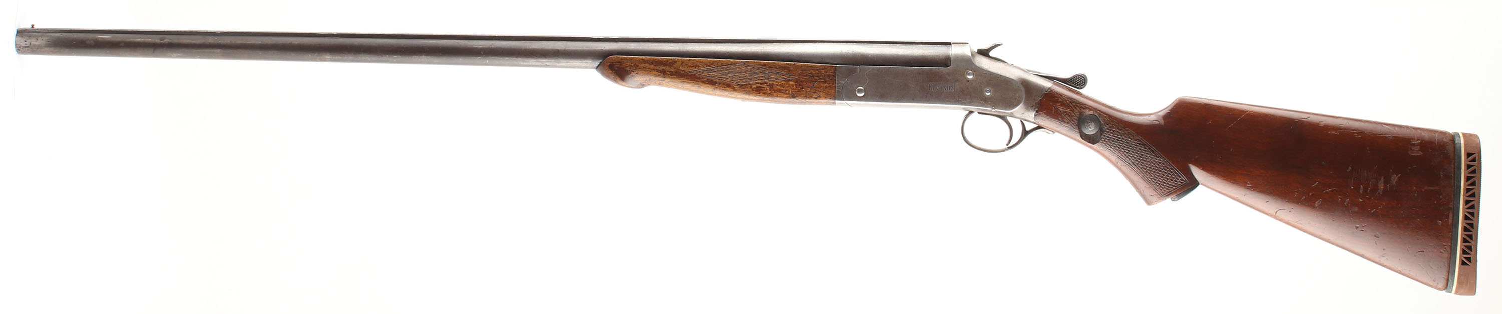 H.S.B & Co. Rev-O-Noc, CAL: 12GA, MFG: N/A, SN: 83513, Break Action Single Shot Shotgun, Choke: Full, 30'' barrel. The original checkered flat pistol grip stock is good & solid. There is a bolt through the middle of the wrist, along with scratches, scrapes, dings & areas of thinning finish. The grip cap is broken. The blued finish on the barrel has worn to a mix of metal gray, brown patina & remaining finish. The receiver has fully worn to metal gray, with areas toned to a brown patina with intermittent spotting. Bore is good & bright, with intermittent pitting, scarring & roughness. The solid matted rib holds a single front bead & the stock has an oversized Pachmayr ventilated brown rubber recoil pad. FFL or C&R Req. - Value: 100 to 200
