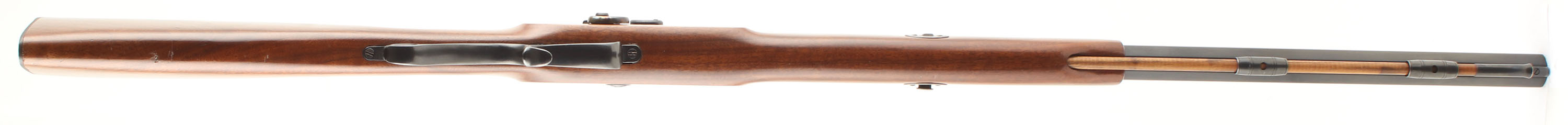 CONDITION: The straight wrist walnut half-stock is excellent with only a few minor nicks & scuffs from handling. Black metal trigger guard that extends as a semi-pistol grip. The blued metal finish rates 98% overall with a few light scuffs & spots of wear near the muzzle. The lock plate & hammer retain 99% of its beautiful case-hardened finish & have ornate engravings. Right side of the barrel has MFG & caliber Information, right side holds the S/N. The bore is excellent. Bright & shiny with little visible wear. The barrel holds a white beaded blade front sight in a dovetail, barrel tang holds a windage & elevation adjustable zero, aperture rear sight. The stock carries a metal buttplate. The rifle has no sling provision. Rifle comes with a double ended, wooden ramrod. Double set triggers, front trigger can fire set & un-set. Mechanical function is solid. A like new beautiful muzzleloader that would make a excellent shooter or hunting rifle. Muzzleloader, No FFL Req - Value: 250 to 500
