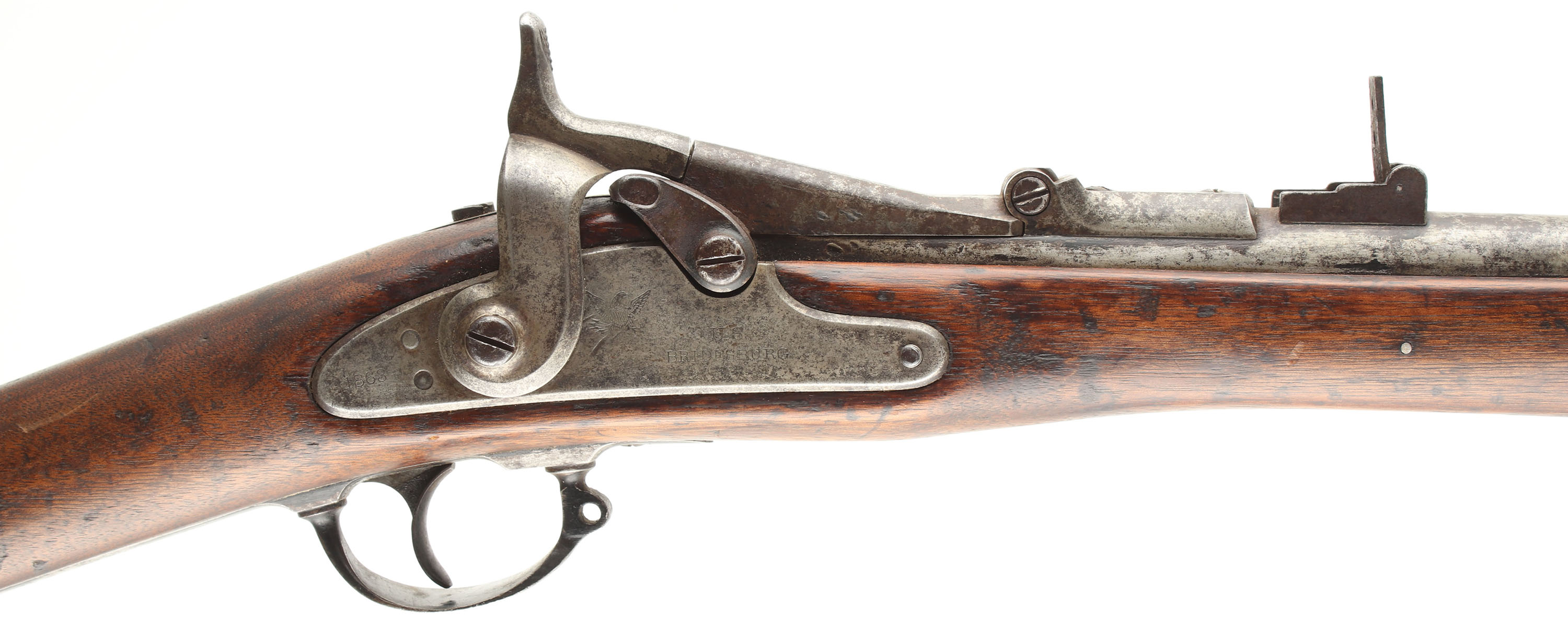 CONDITION: The straight wrist walnut stock is good with various smoothed over nicks, dings, gouges, & scratches from use. There is a hole worn into the bottom of the forend, just in front of the lock plate that is exposing the ramrod channel & ramrod. This was likely caused by saddle wear from carrying across the saddle when riding, common to see on rifles of this era that saw hard use. The right side of the forend has some cracks & wood split repairs. Left flat of the stock has a faded inspector cartouche. The metal has worn gun metal gray with light roughness across the metal & remains of a added black paint in protected areas on all parts of the rifle. The breech block is marked ''1866'', over a eagles head. The lock plate is marked ''1863'', a partial faded American great eagle next to ''US'', over ''BRIDESBURG''. Two-click action. The bore is good to fair. It has thinned rifling with roughness/light pitting. The barrel holds a barleycorn front sight with the original musket L-leaf notch/aperture rear sight. The stock carries a metal buttplate that is a mix of black paint finish, gun metal gray & brown patina. Rifle has the factory front sling loop with the rear loop missing. Rifle has what appears to be a home made ramrod to display with the rifle (end cap threaded). Mechanical function appears solid but with a little ''grittiness'' when the hammer is cycled. Antique, No FFL Req - Value: 600 to 1200