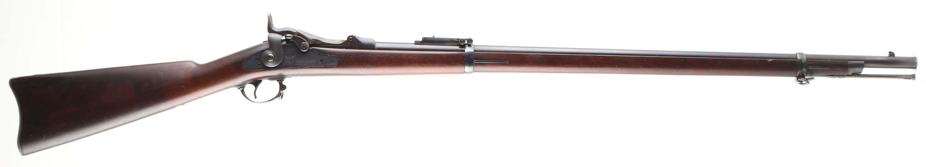 CONDITION: The straight wrist walnut stock is excellent with only a couple superficial nicks & scratches & minor finish wear in handling spots. The stock appears to never been sanded with the cartouches being legible & crisp. The left flat of the stock has the acceptance/inspector's cartouche ''SWP'' over ''1891'' inside a box. The bottom of the wrist is stamped ''O.B'' & the ''P'' in circle firing proof. The metal carries its original blue & rates 98% overall with spots of minor thinking & a couple small nicks & scratches. The breech block & wrist tang retains its original, deep case-hardened finish & rates 98% as well. The markings on the metal are all crisp & legible with thinning caused by poorly struck markings on rounded surfaces. The breech block is marked ''US'', over ''MODEL'', over ''1884''. The rear of the receiver has the S/N. left side of the chamber marked ''V'', over ''P'', over a eagle's head, over ''P'', & the top is marked ''A''. The lock plate is marked with a American great eagle next to ''US'', over ''SPRINGFIELD''. Both barrel bands are marked ''U''. upper extension of buttplate marked ''US''. The bore is excellent near MINT. It's bright & mirrorlike, sharp & deep rifling with no visible wear. The barrel holds a barleycorn front sight with a Buffington ladder rear sight. The stock carries a blued steel buttplate. plate retains most of its blue with spots worn gray & toning brown. Rifle has both factory sling loops with the third stacking loop & the cleaning/clearing rod. a STUNNING example of a 1884 Trapdoor that appears to have been unissued retaining all its original finish, parts & appearing to never have a screw removed. Antique, No FFL Req. - Value: 2000 to 4000