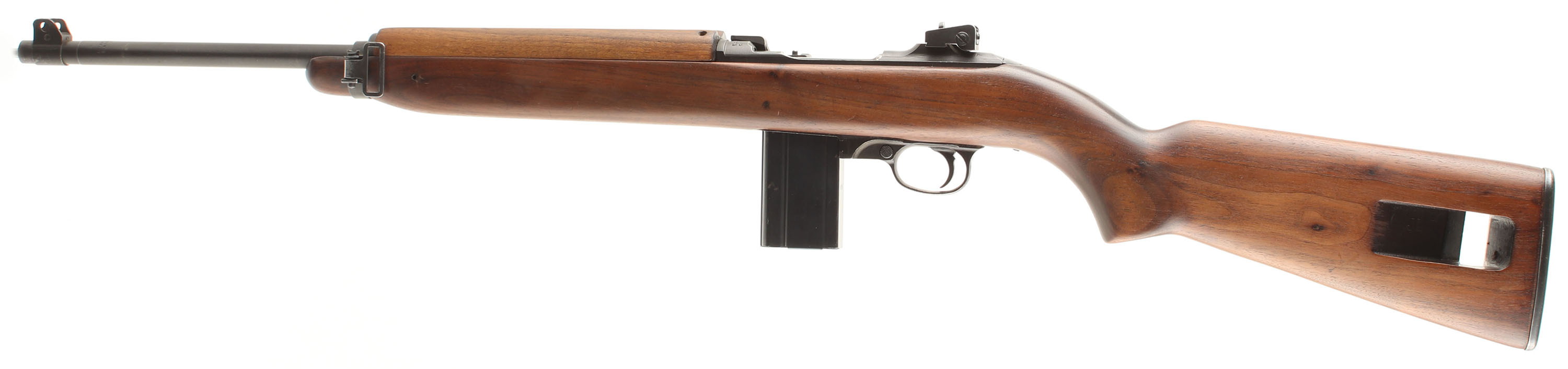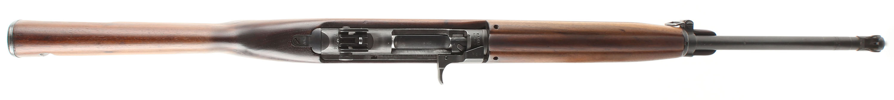 CONDITION: The type 2, semi-pistol grip walnut stock is very good as being lightly sanded & re-finished. The sling well is marked ''JL B'' for manufacture at Jamestown Lounge Co. Jamestown, NY, their prime contractor was IBM, not Inland. No visible cartouches on the stock. The black parkerized finish rates 90% overall with some spots of thinning & wear. The receiver band is marked ''U.S. CARBINE'', ''CAL .30 M1''. The rear of the receiver is marked ''INLAND DIV.'' & the S/N. The end of the barrel is marked ''INLAND MFG. DIV.'', ''GENERAL MOTORS'', ''11-42'', ''P''. The top of the receiver, just ahead of the rear sight has a punch mark. This is a leftover mark from the Rockwell B Hardness test. The bolt, bolt handle, & wrist tang have the last three digits of the S/N stamped into them, this is indication of foreign rebuilt/refurbishment as the US did not officaly mare parts like this. The bore is very good. It's bright & shiny with thinned rifling & light roughness. The barrel holds a blade front sight with protective wings. The rear of the receiver holds the updated fully adjustable aperture rear marked out to 300 yards. The stock carried a checkered parkerized steel buttplate, edges are worn gray. Rifle has the front sling loops with the rear well. Period correct no bayonet lug as they were added near the end of the war, & early push button safety. Rifle comes with one 15 Rd. magazine marked ''MN'' on the back spine. Mechanical function appears solid. FFL or C&R Req - Value: 1000 to 2000