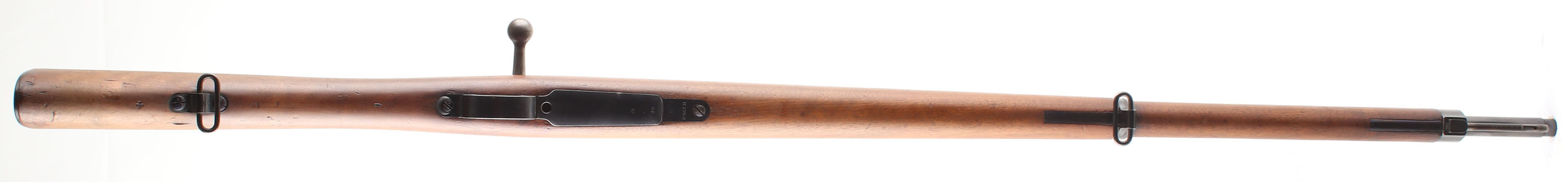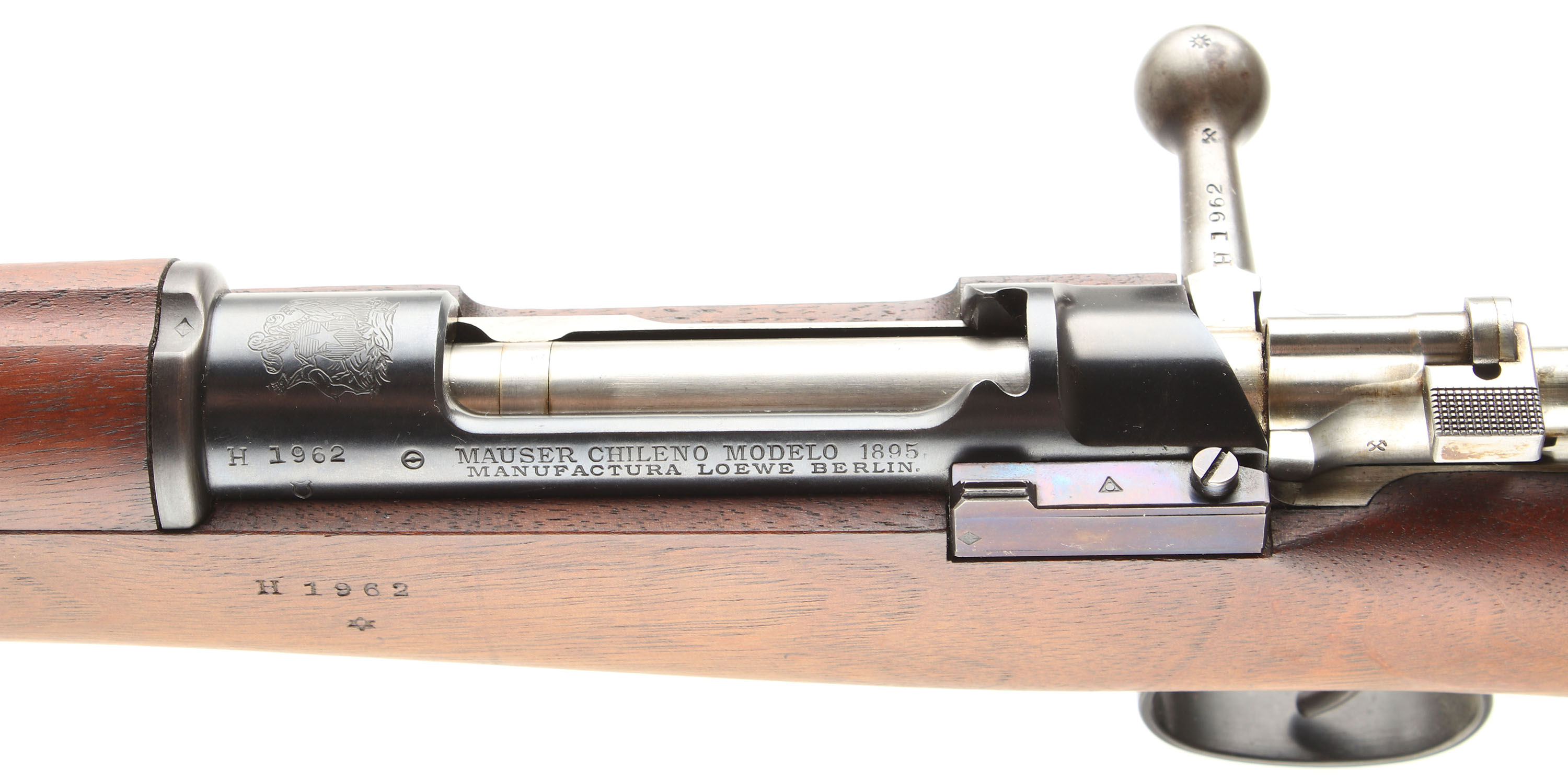 CONDITION: The straight wrist walnut stock is very good near excellent with superficial nicks, dings, & scratches. a couple vice marks present on stock. The left cheek of the stock is stamped with the Chilean acceptance stamp of the Chile coat of arms over ''1895''. The left side of the stock is stamped with the S/N, just below the S/N marking on the receiver. Small cartouche on the upper handguard. All markings are crisp & legible with exception to the acceptance stamp, its worn on the bottom edge. The metal carries a beautiful arsenal deep blue re-finish with only minor thinning of some markings & almost no visible roughness under the finish. The blued metal finish rates 99% on the receiver & 98% on the barrel with a few spots of light thinning overall with a few spots of light thinning & one small spot of roughness on the top of the barrel. The left side of the receiver is marked with the S/N, two proof marks, ''MAUSER CHILENO MODELO 1895'', ''MANUFACTURA LOEWE BERLIN.''. The top of the receiver is stamped with the Chilean coat of arms. Other metal parts have various proof marks. S/N matching bolt (& its components), magazine floorplate, trigger guard/magazine housing, & cleaning rod. The bore is excellent. Bright & mirrorlike with little to no visible wear. The barrel holds a barleycorn front sight with a flip-up ladder, V-notch rear sight marked 5 to 20. The stock carries a blued steel buttplate with finish wear around the edges. The rifle has both bottom sling loops & has a cleaning rod. a beautiful condition Chilean Mauser. Antique No FFL Req - Value: 500 to 1000