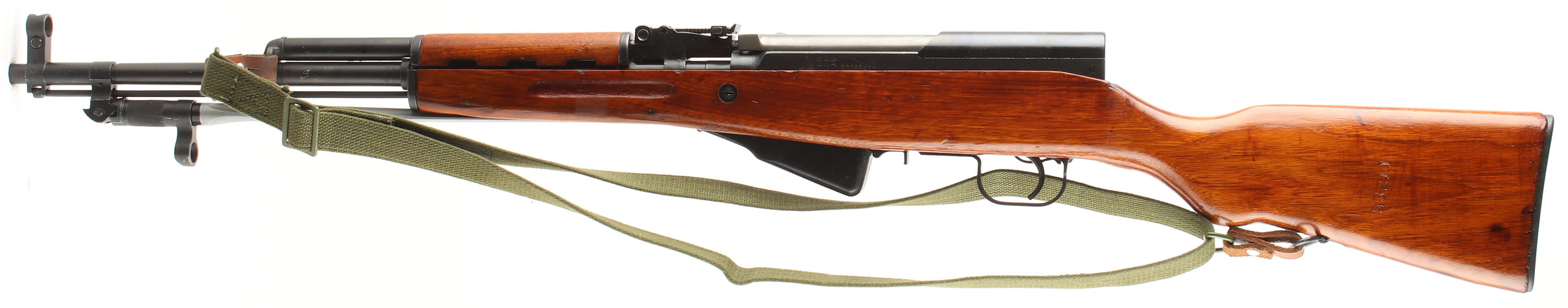 CONDITION: The semi-pistol grip wood stock is excellent with a factory high gloss lacquer but has a couple small scuffs on the edges & some superficial scratches. Left cheek of stock marked with last five digits of the S/N, & The top of the comb is stamped ''82'' in a circle. Left flat of the stock above the mag has a small triangle stamp. The blue metal finish rates 95% overall with small scratches & wear spots on the barrel & the receiver. Left side of the receiver is marked ''636'' in a triangle, ''TYPE 56 CARBINE'' in Chinese, & the S/N. bottom of the barrel, just in front of the forend is marked with import stampings. S/N matching magazine, trigger guard, receiver cover, bolt, bolt carrier, & gas tube (gas tube is electro penciled which is factory). The bore is excellent. It's bright & mirrorlike with little to no visible wear. Chrome lined bore. The barrel holds a post front sight with protective globe, Tangent U-notch rear sight with a ''3'' battle zero mark & 1 to 10 marks. The blue steel trapdoor buttplate has a cleaning kit inside. Rifle has the affixed folding cruciform bayonet & the cleaning rod. Rifle has both factory sling loops & comes with a period correct green canvas sling. Mechanical function appears solid. FFL or C&R Req. - Value: 450 to 850