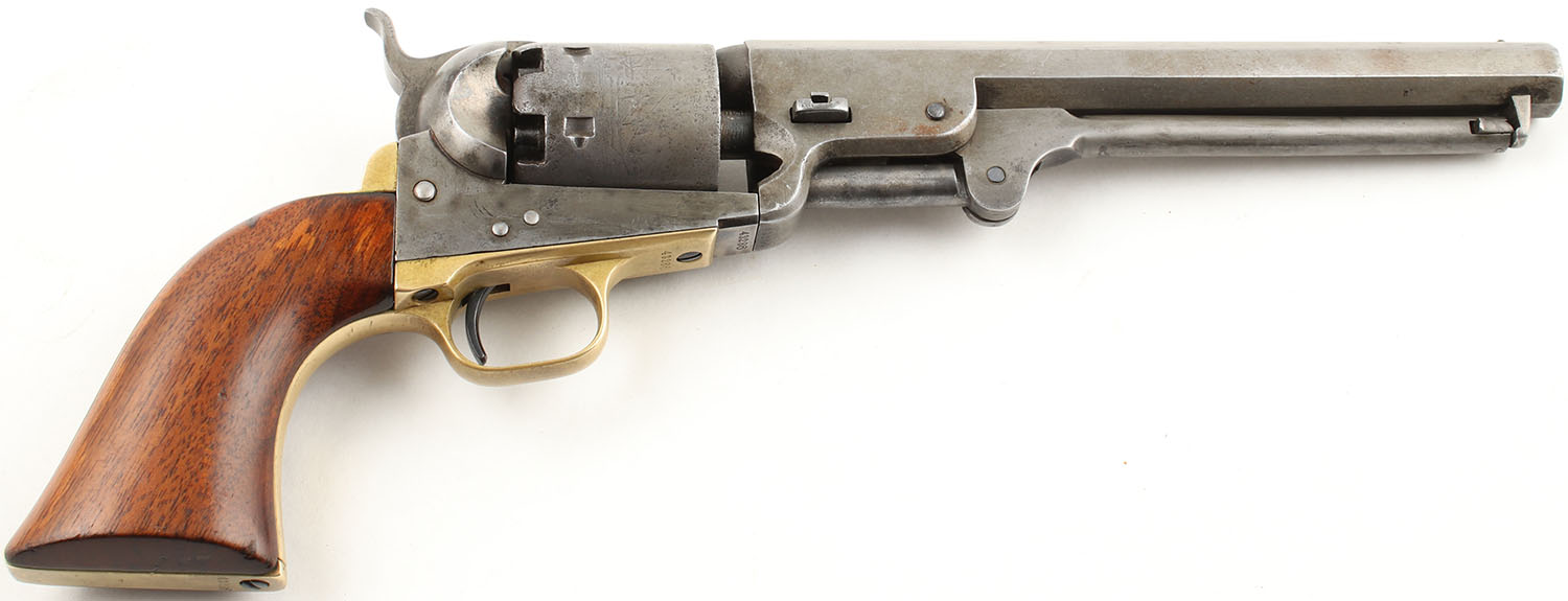 Colt, Model 1851 Navy, CAL: 36, MFG: 1855, SN: 43286, Single Action Percussion Revolver, 7 1/2'' barrel. The top of the barrel has a standard single line roll-stamp that reads ''ADDRESS SAM L COLT NEW YORK CITY''. ''COLTS PATENT'' is stamped on the left side of the frame, this stamp has begun to wear thin but is still fairly legible. No visible caliber marking. The Naval scene on the cylinder is worn thin but is still approximately 50% visible with the text on the cylinder being thinned & mostly legible with only one or two characters that are obscured. All matching SN on the barrel housing, frame, trigger guard, & backstrap. There is a nonmatching serial number on the barrel wedge that reads ''3588''. The wood grips are excellent, solid with minimal wear. The metal on the gun is mostly gun metal grey with a very thin splotchy brown patina throughout. The brass on the gun is very nice & slightly tarnished but would likely clean up nicely. Bore is poor to fair, the rifling is fairly strong but the bore has darkened substantially with even roughness & pitting throughout. Mechanically solid, seems to function properly. All four clicks seem to be present. Antique, No FFL Req. - Value: 1200 to 2400