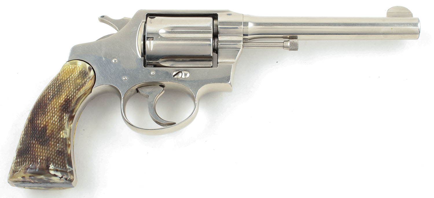 Colt, Police Positive, CAL: 38 SPL, MFG: 1924, SN: 288290, DA/SA Revolver, 5'' Barrel. The checkered plastic multicolor grips are excellent with minimal wear. The metal holds a nickeled finish. The nickeled finish is very good to excellent. The gun has near total coverage with some exposed gun metal grey concentrated near the muzzle & on the backstrap & butt of the grip. The factory markings are slightly thinned but still visible & legible. Bore is very good, near excellent, the rifling is strong & bright with very light roughness throughout. Mechanically solid, seems to function well. A fixed front sight is integral to the barrel, a rear sight notch is cut into the frame. Comes with a ''Eubanks Leather'' brand leather holster with 87PP stamped into it. FFL or C&R Req. - Value: 400 to 800