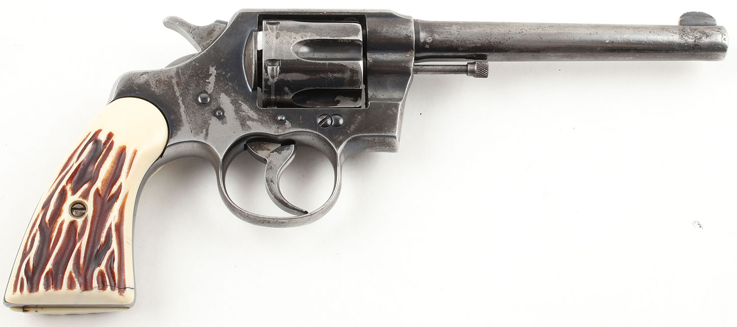 Colt, Army Special, CAL: 32-20 WCF, MFG: 1924, SN: 505149, DA/SA Revolver, 6'' Barrel. The faux stag grips are fair, they have two substantial cracks. There is a large crack on the left grip panel that runs vertically down the majority of the grip. There is a horizontal crack on the bottom of the right grip that runs about half way across the grip. The metal holds the factory blue finish. The blue on the barrel rates approximately 30% the sides of the barrel being worn down to gun metal gray with speckled shallow pitting. The frame rates approximately 60% with substantial handling wear as well as what appears to be some kind of chemical erosion causing the surface of the metal to flake & peel away. The factory markings are relatively crisp & all legible. Bore is good to very good, the rifling is strong & bright with very light roughness throughout & a couple of small spots of deep pitting throughout. Mechanically solid, seems to function well. A fixed front sight is integral to the barrel, a rear sight notch is cut into the frame. FFL or C&R Req. - Value: 300 to 600