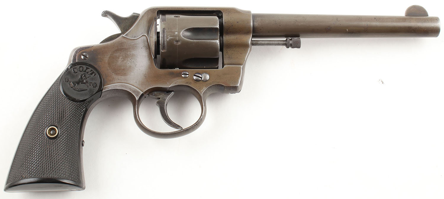 Colt, Model 1903 Navy, CAL: 38 Long Colt, MFG: 1906, SN: 270268, DA/SA Revolver, 6'' Barrel. The checkered vulcanized rubber grips with Rampant Colt logos are excellent with minimal wear. There is a thin layer of applied brown finish on the gun. There is some non-factory blue in protected areas as well as some original blue visible on the left side of the trigger. The factory markings are relatively crisp & all legible. Bore is good, the rifling has thinned slightly & the bore has darkened with very light roughness throughout & a couple of small spots of deep pitting throughout. Mechanically poor, this firearm is not fully functional. The cylinder will occasionally fail to rotate when the hammer is drawn to the rear or the trigger is pulled (this happens more consistently when the firearm is pointed up). The cylinder latch moves rearwards when the hammer is drawn & falls forward with the hammer. This firearm requires some professional gunsmithing to function properly. A fixed front sight is integral to the barrel, a rear sight notch is cut into the frame. SOLD ''AS IS'' NO RETURNS. FFL or C&R Req. - Value: 200 to 600
