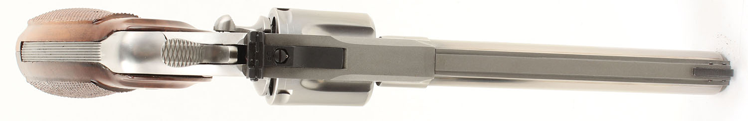 Colt, Python, CAL: 357 MAG, MFG: 1983-96, SN: K98725, DA/SA Revolver, 6'' Barrel. The factory checkered wood grips with Rampant Colt medallions are excellent with light handling wear. The matte stainless finish on the gun is excellent with minimal wear & a pronounced drag line. The factory markings are all crisp. Bore is excellent, bright with strong rifling & light even roughness near the muzzle. Mechanically very solid, seems to function well. The barrel holds a serrated ramp front sight, a windage & elevation adjustable rear sight is mounted to the frame. Comes in a generic soft pistol case. FFL Req. - Value: 1800 to 2500