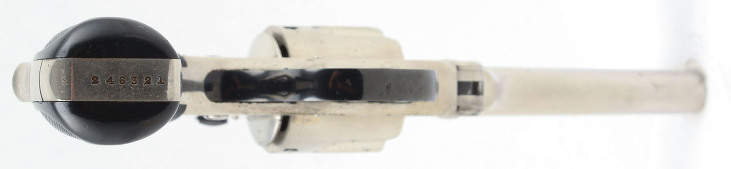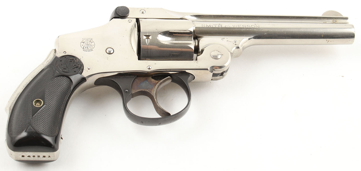 Smith & Wesson, .38 Safety Hammerless, CAL: 38 S&W, MFG: 1907-40, SN: 246321, Double Action Revolver, 4'' barrel. The top of the barrel is marked ''SMITH & WESSON SPRINGFIELD MASS USA''. The left side of the barrel is marked ''+38 S&W CTG+'', the right side of the barrel was marked ''SMITH & WESSON''. The right side of the frame is marked with the S&W trademark logo. The S&W monogram checkered hard rubber grips are excellent. The original nickel finish rates 95% overall, with visible brush strokes & intermittent light speckling. Case-colored trigger retains visible case-colors. Bore is excellent. Fixed notch rear sight & pinned blade front sight. A nice original example of a .38 Safety Hammerless. FFL or C&R Req. - Value: 600 to 1000