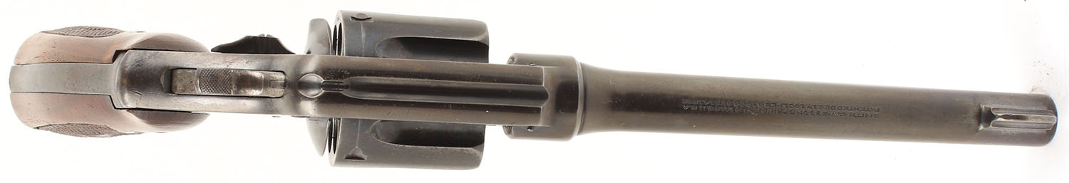 Smith & Wesson, 44 Hand Ejector 2nd Model, CAL: 44 SPL, MFG: 1915-40, SN: 24481, DA/SA Revolver, 6 3/8'' Barrel. The factory checkered wood grips with S&W medallions are very good, near excellent with some handling wear & edge wear on the border surrounding the checkering. The metal holds the factory blued finish which retains approximately 40% originality. The blue has near total coverage. There is exposed gun metal grey is located in common wear areas such as: the barrel near the muzzle, the cylinder (drag line), the grip (front strap/backstrap), & on the edges. Some of the blue has worn thin & begun to tone to a brown patina. The factory markings are slightly thinned but still visible & legible. There is a flower electric penciled into the right side of the frame behind the cylinder. Bore is very good, the rifling is very slightly thinned & relatively bright with a couple of instances of very deep pitting that are spread out. Mechanically solid, seems to function well. The barrel holds a fixed front sight, a rear sight notch is cut into the top of the frame. FFL or C&R Req. - Value: 700 to 1400