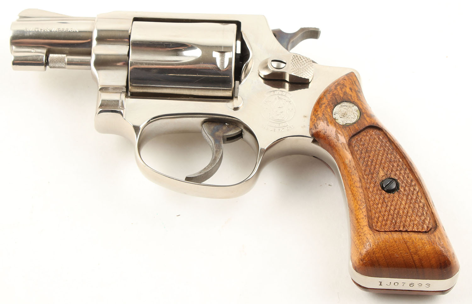 BOXED Smith & Wesson, Model 36, CAL: 38 SPL, MFG: 1982, SN: 1J07693, DA/SA Revolver, 2'' Barrel. The factory checkered wood grips with ''S&W'' medallions are excellent, solid with slightly worn checkering. The metal holds a nickeled finish. The finish is excellent with light use wear including a drag line, some wear near the muzzle & some wear on the front strap & backstrap of the grip. The case coloring on the trigger & hammer is very good, slightly faded. All of the standard markings around the gun are crisp. Bore is excellent, bright with strong rifling. Mechanically solid, seems to function well. The barrel holds a serrated fixed front ramp sight with some red paint or finger nail polish. A rear sight notch is cut into the top of the frame. Comes in a non-serially matching box that is correct to the make, model, & era with some related paperwork & wax paper. FFL Req. - Value: 400 to 600