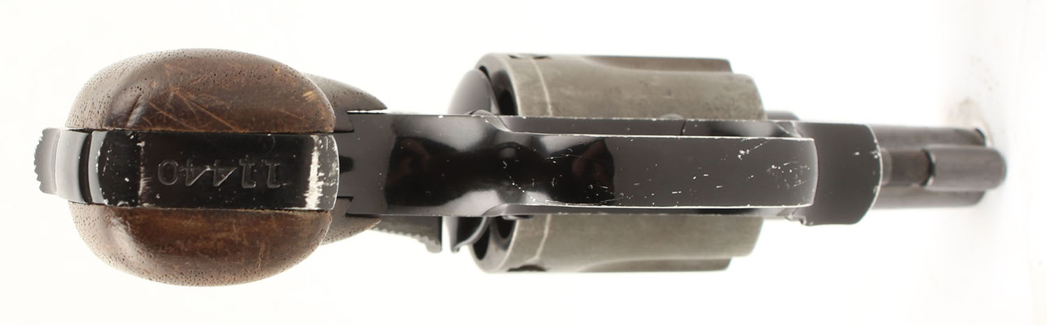 Smith & Wesson, Model 42 Airweight, CAL: 38 SPL, MFG: 1952-71, SN: 11440, DAO Revolver, 2'' Barrel. The factory smooth wood grips with ''S&W'' medallions are very good, solid with substantial wear from carry & use, the protective clear coat that was applied to the wood at the factory has worn almost entirely away. The alloy frame holds a black finish, the finish is very good with substantial edge wear. The blue on the cylinder has worn thin & begun to tone to a brown patina leaving a mix of gun metal gray, original blue, & brown patina. The blue on the barrel has some small splotches of clean shallow pitting as well as some dings on the muzzle & holster wear. All of the standard markings around the gun are crisp. Bore is very good, bright with strong rifling & a couple of small deep pits near the muzzle. Mechanically solid, seems to function well. The front sight appears to have been ground off. A rear sight notch is cut into the top of the frame. FFL or C&R Req. - Value: 200 to 400