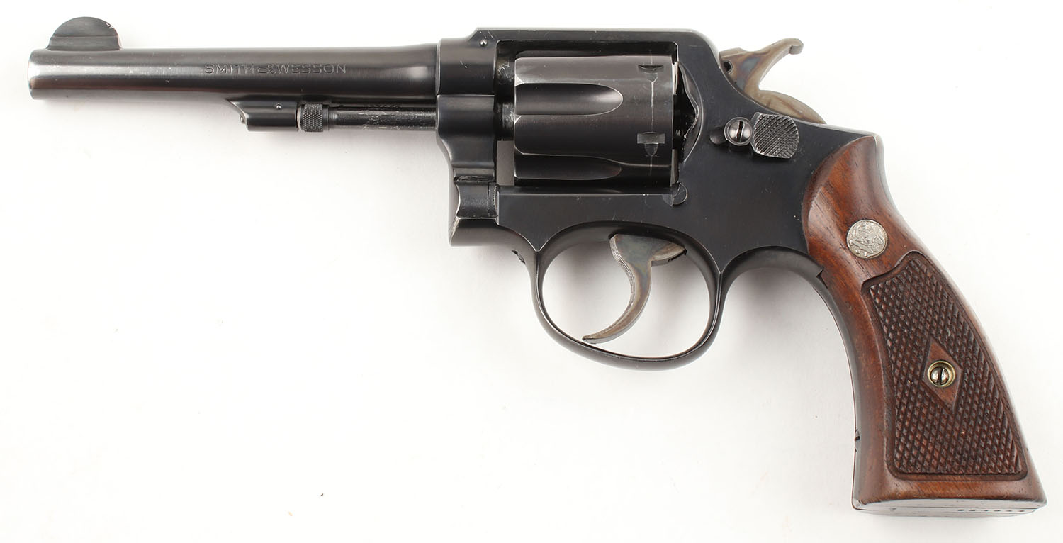 Smith & Wesson, Military & Police ''Pre-Model 10'', CAL: 38 SPL, MFG: 1945-47, SN: S823054, DA/SA Revolver, 5'' Barrel. The factory checkered wood grips with ''S&W'' Medallions are excellent with light edge wear & some small dings & scratches throughout. The factory blued finish on the gun rates approximately 85% with consistent use wear. There is a very defined drag line on the cylinder that has worn to gun metal gray. The blue on the barrel near the muzzle has thinned from holster wear. The front strap has some thinning & scratches from handling & the backstrap has toned almost entirely to a brown patina & thinned substantially. There are some small surface scratches throughout. All of the standard markings around the gun are visible & legible. Bore is excellent, bright with strong rifling. Mechanically solid, seems to function well. The barrel holds a fixed front blade sight. A rear sight notch is cut into the top of the frame. FFL or C&R Req. - Value: 400 to 600