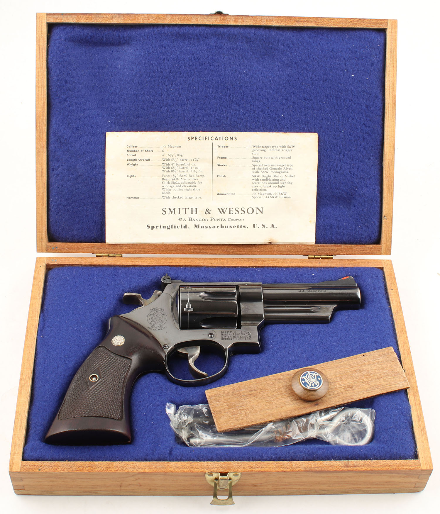 Smith & Wesson, Model 29, CAL: 44 MAG, MFG: 1959-60, SN: S196592, DA/SA Revolver, 4'' Barrel. The factory checkered wood grips with ''S&W'' medallions are very good, near excellent, with some handling wear & small dings & surface scratches throughout. There are also some very small edge chips throughout. The original blue rates approximately 90% with light wear. The cylinder has a clear drag line, the muzzle has some holster wear, & the backstrap has some thinning. There is a clear consistent scratch pattern throughout. All of the standard markings around the gun are crisp. Bore is excellent, bright with strong rifling. Mechanically solid, seems to function well. The barrel holds a fixed front sight with a red plastic insert. A windage & elevation adjustable rear sight is mounted to the top of the frame. Comes with a custom wood display case. The case is lined with blue fabric under which is formed plastic that fits the gun nicely & has a slot for a cleaning rod. A cleaning rod is present with a brush, there is a wood lid for the cleaning rod section which seems to be well made and holds a ''S&W'' medallion. The gun also comes with Smith & Wesson wax paper & a specifications sheet. FFL or C&R Req - Value: 800 to 1600