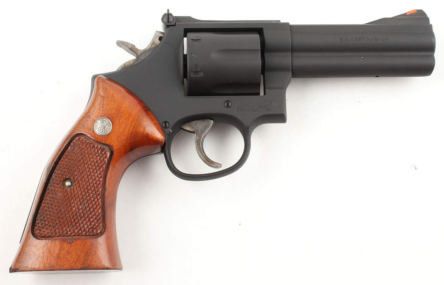 Smith & Wesson, Model 586-1 ''Distinguished Combat Magnum'', CAL: 357 MAG, MFG: 1986-99, SN: AUV6804, DA/SA Revolver, 4'' Barrel. The factory checkered wood grips with ''S&W'' medallions are very good, near excellent, with some handling wear & small dings & surface scratches throughout. There are also a couple of edge chips throughout & a splintered section near the edge of the checkering. The metal carries what appears to be a non-factory professionally applied parkerized finish. The finish is excellent with a drag line & light use wear. All of the standard markings around the gun are slightly faded from the Parkerizing process but still visible & legible. Bore is excellent, bright with strong rifling. Mechanically solid, seems to function well. The barrel holds a fixed front sight with a red plastic insert. A windage & elevation adjustable rear sight with a white square ''U'' notch is mounted to the top of the frame. Comes with a Smith & Wesson factory cardboard box for a 586 with a non matching serial number & other packing material. FFL or C&R Req - Value: 500 to 1000
