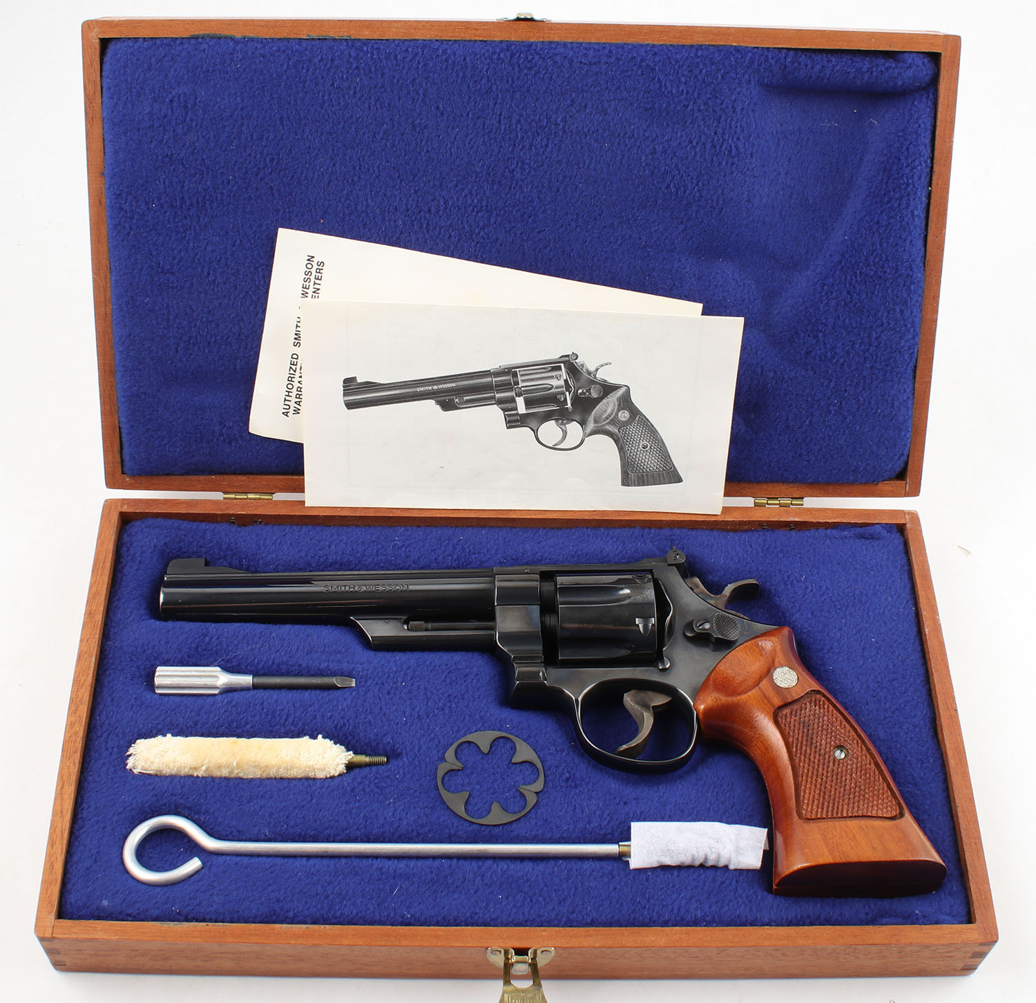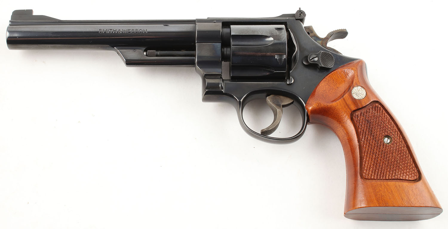 Smith & Wesson, Model 25-2, CAL: 45 ACP, MFG: 1979-80, SN: N672371, DA/SA Revolver, 6 1/2'' Barrel. The factory checkered wood grips with ''S&W'' medallions are excellent, solid with little to no wear & sharp checkering. The factory blued finish rates approximately 99% with minimal wear. All of the standard markings around the gun are crisp. Bore is excellent, bright with strong rifling. Mechanically solid, seems to function well. The barrel holds a fixed front sight. A windage & elevation adjustable rear sight is mounted to the top of the frame. Comes in a very nice custom made wood case with fitted foam that is lined in blue cloth. Inside the case is a screw driver, a bore mop, a cleaning rod, wax paper, an owners manual, & other related paperwork. FFL or C&R Req. - Value: 900 to 1400