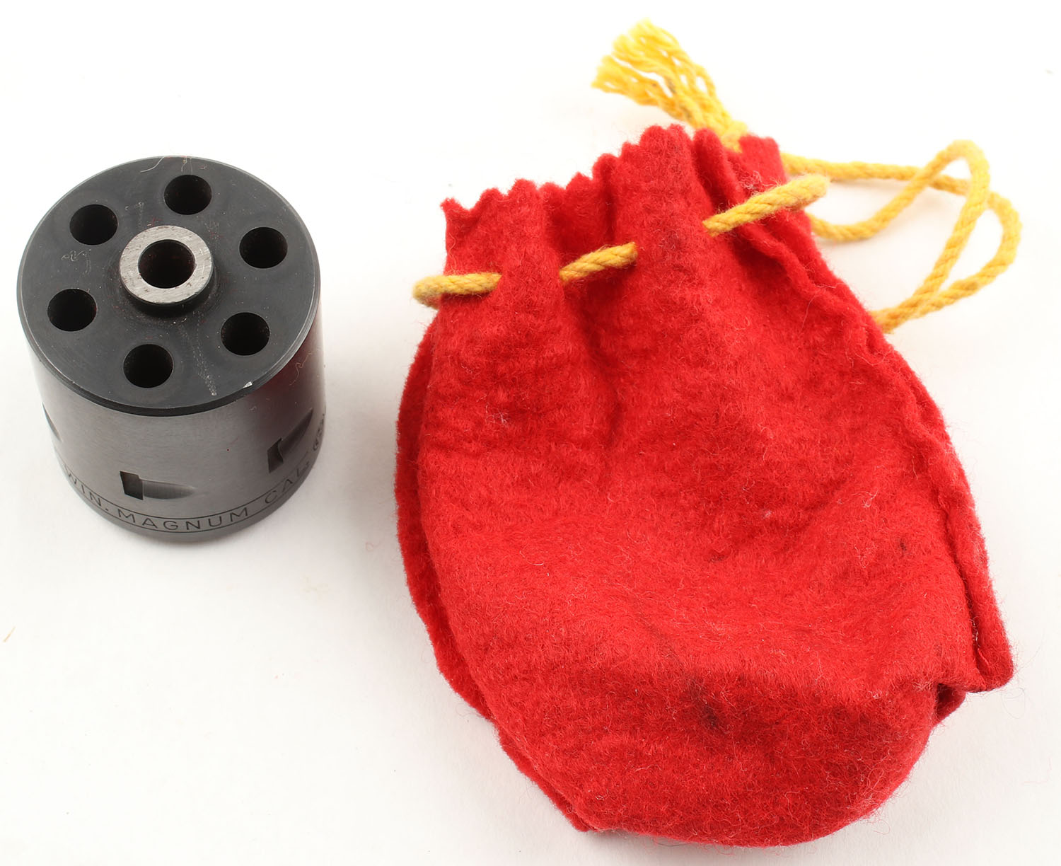 Ruger, New Model Single Six, CAL: 22 LR, MFG: 1980, SN: 67-93373, SAO Revolver, 6 1/2'' Barrel. The factory wood grips with Ruger medallions are very good, near excellent, with some wear including light edge chipping & some small dings & scratches. The factory blued finish on the gun rates approximately 98% with light wear from use. All of the standard markings around the gun are crisp. Bore is excellent, bright with strong rifling. Mechanically solid, seems to function well. The barrel holds a fixed front sight. A windage & elevation adjustable rear sight is mounted to the top of the frame. Comes with a 22 MAG conversion cylinder in a red pouch. FFL Req. - Value: 250 to 500