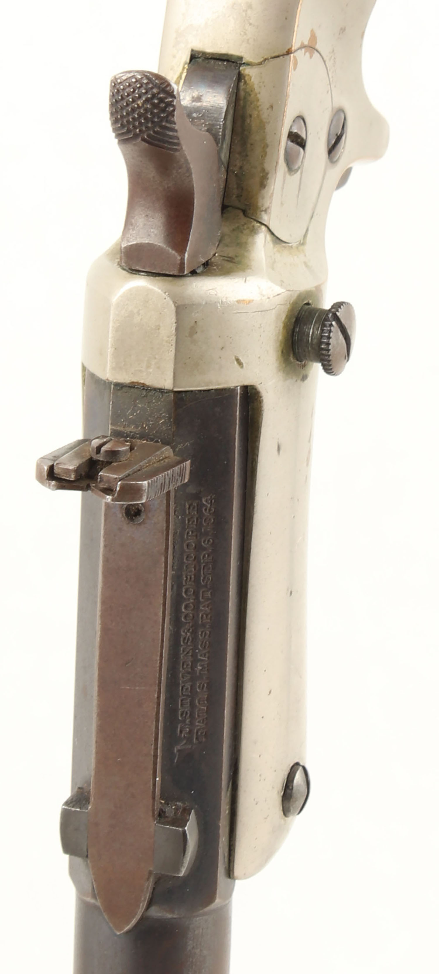 CONDITION: The wood grips are very good, solid with light wear & several gouges on the side of the left grip panel. The nickeled finish on the brass frame retains approximately 60% coverage & has a thick layer of haze. The stock has some small remainders of nickel in protected areas. The blue on the barrel has toned to a thick chocolate patina with some original blue in protected areas. Bore is good, slightly darkened and strong with some splotches of shallow pitting & consistent roughness throughout. Mechanically solid, seems to function well. The barrel holds a hooded fixed front sight & a flip up rear sight. Antique, No FFL Req. - Value: 400 to 800