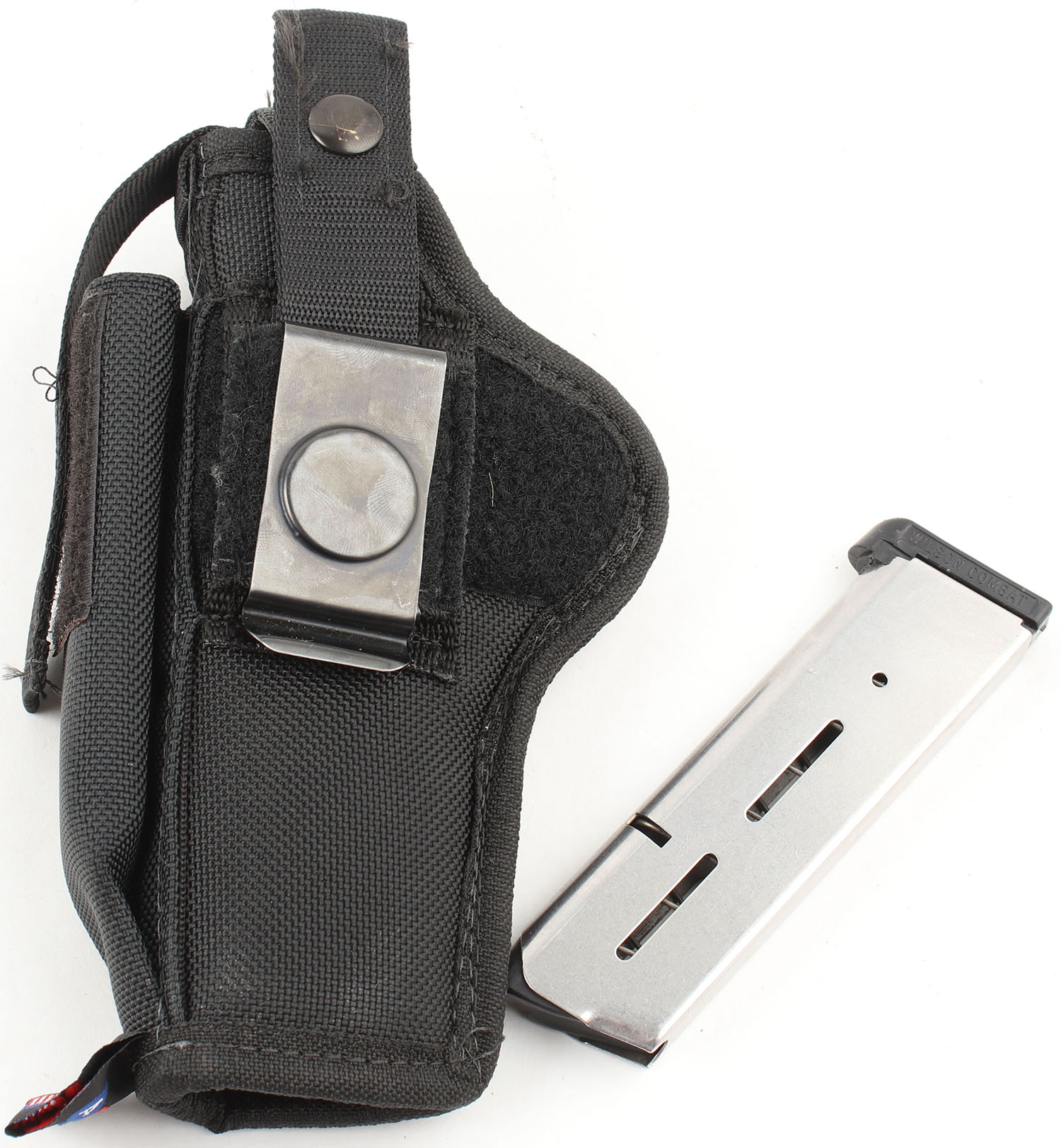 Colt, Series 80 MKIV Gold Cup National Match, CAL: 45 ACP, MFG: 1993, SN: SN04898E, Single Action Semi Auto Pistol, 5'' Barrel. The textured rubber grips with colt medallions are in excellent condition with minimal wear. The stainless finish is very good, near excellent, with very light wear and some small surface scratches. Bore is very good, bright with slightly thinned rifling. Mechanically solid, seems to function well. The parts fitment is very good, the slide/frame fitment is fairly tight with very little play. This 1911 seems to have slightly better parts fitment than one would expect from a colt of this era. The slide holds a fixed front sight and a windage and elevation adjustable rear sight. The sight picture is all black. Comes with a generic soft nylon holster and two Wilson combat magazines. FFL Req. - Value: 800 to 1600