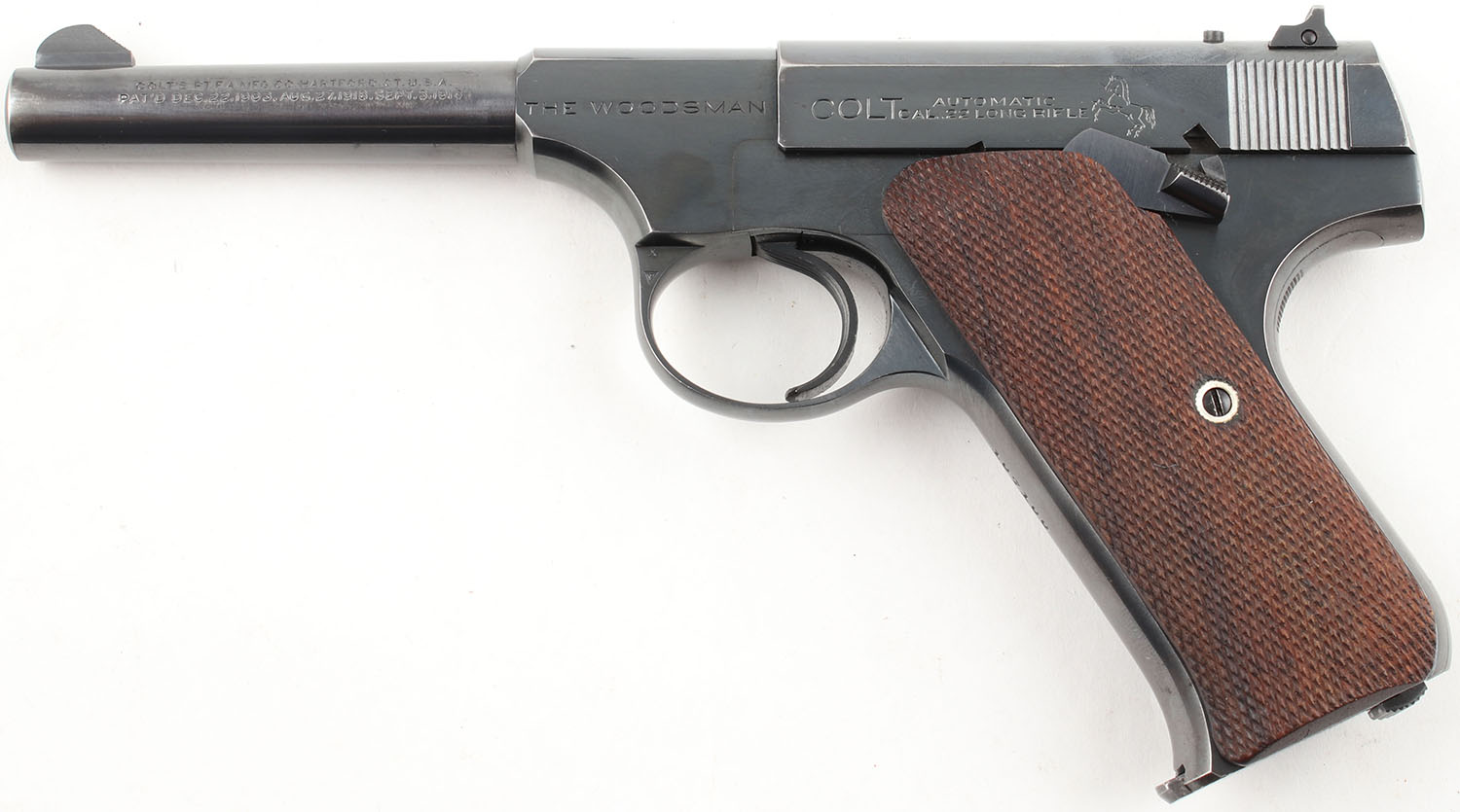 Colt, Woodsman 1st Series Sport Model, CAL: 22 LR, MFG: 1937, SN: 107100, Semi Auto Pistol, 4 1/2'' Barrel. The factory checkered wood grips are in excellent condition, sold with minimal wear. The blued finish on the gun rates approximately 95% with some handling and holster wear. Most of the wear is concentrated on the front strap and backstrap of the grip with some wear on the barrel near the muzzle as well as very light edge wear. Bore is excellent, bright with strong rifling. Mechanically solid, seems to function well. The barrel holds a fixed front sight, there is a rear sight set in a dovetail cut on the slide. The sight picture is all black. Comes with a magazine. FFL or C&R Req. - Value: 900 to 1700