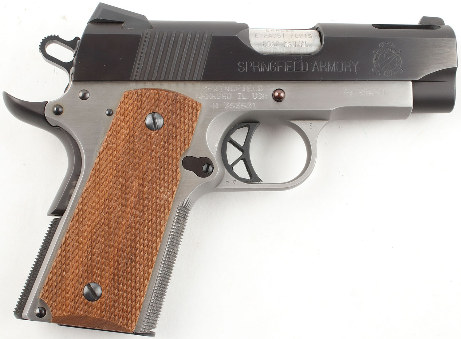 Springfield Armory (Brazil), ''Super Tuned V10 Ultra Compact'' (Officer Size 1911), CAL: 45 ACP, MFG: Modern, SN: N363621, SAO Semi Auto Pistol, 3 1/2'' Bull Barrel With V10 Ports. The checkered wood grips are excellent with minimal wear. The blued finish on the slide rates approximately 99% with minimal wear. The stainless finish on the frame is excellent with light wear from use & handling, including a couple of ''idiot scratches'' on the left side of the frame near the trigger. The blue on the safety, slide stop/side release, grip safety, & magazine release has toned to a plumb patina. Bore is excellent, bright with strong rifling. Mechanically solid, seems to function well. The slide holds fixed all black sights. Comes with a magazine. FFL Req. - Value: 500 to 1000