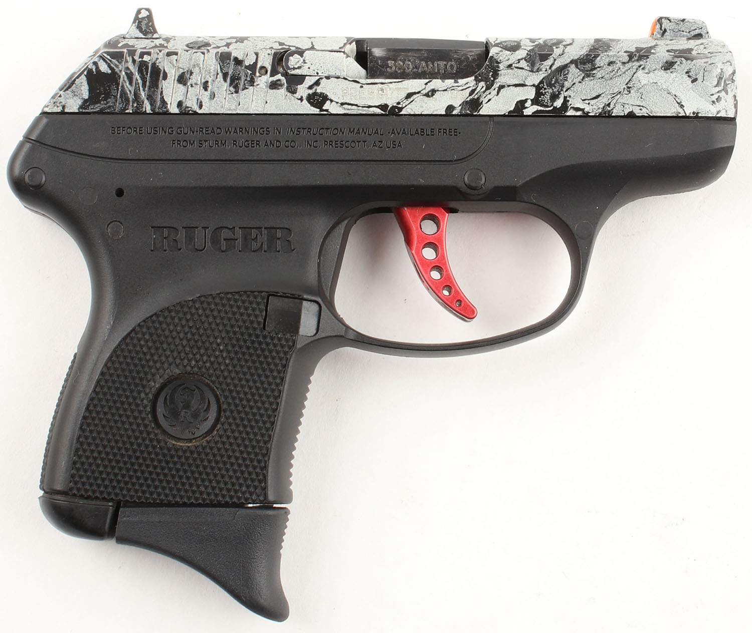 Ruger, LCP, CAL: 380 Auto, MFG: Modern, SN: 371659540, Double Action Only Semi Auto Pistol, 2 3/4'' Barrel. The polymer grip frame is excellent with little to no wear. The slide appears to have been ''Hydrodipped'' leaving a coat of paint, the paint is fairly intact with some original finish showing on the worn edges. Bore is excellent, bright with strong rifling. Mechanically solid, seems to function well. The trigger appears to have been replaced with a skeletonized red metal trigger. The function of the trigger does not seem different from a standard LCP in any way (Including pull weight). The slide holds fixed iron sights that are coated in the same paint as the slide, the front sight appears to have been painted orange. The gun comes with a magazine. FFL Req. - Value: 100 to 300