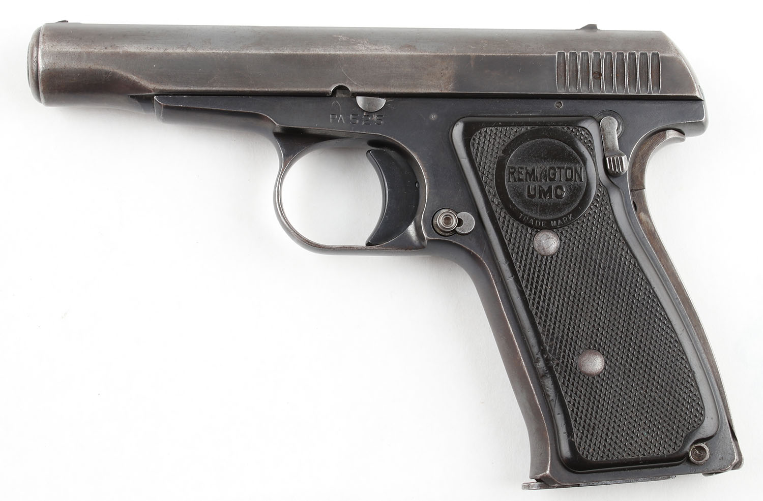 Remington, Model 51, CAL: 380 ACP, MFG: 1919, SN: PA525, Semi Auto Pistol, 3 1/4'' Barrel. The factory checkered plastic grips are very good, near excellent, solid with some small surface scratches throughout as well as some worn checkering from handling. Approximately 20% of the original blue on the gun remains intact in protected areas with the rest of the blue being substantially thinned or toned to a brown patina. Bore is good, it has darkened with rifling that is thin but still pronounced. The bore has even roughness throughout. Mechanically solid, seems to function well. Rudimentary all black sights are integral to the slide, The top of the slide is serrated to reduce glare. Comes with a generic hard plastic case & a magazine. FFL or C&R Req. - Value: 400 to 800