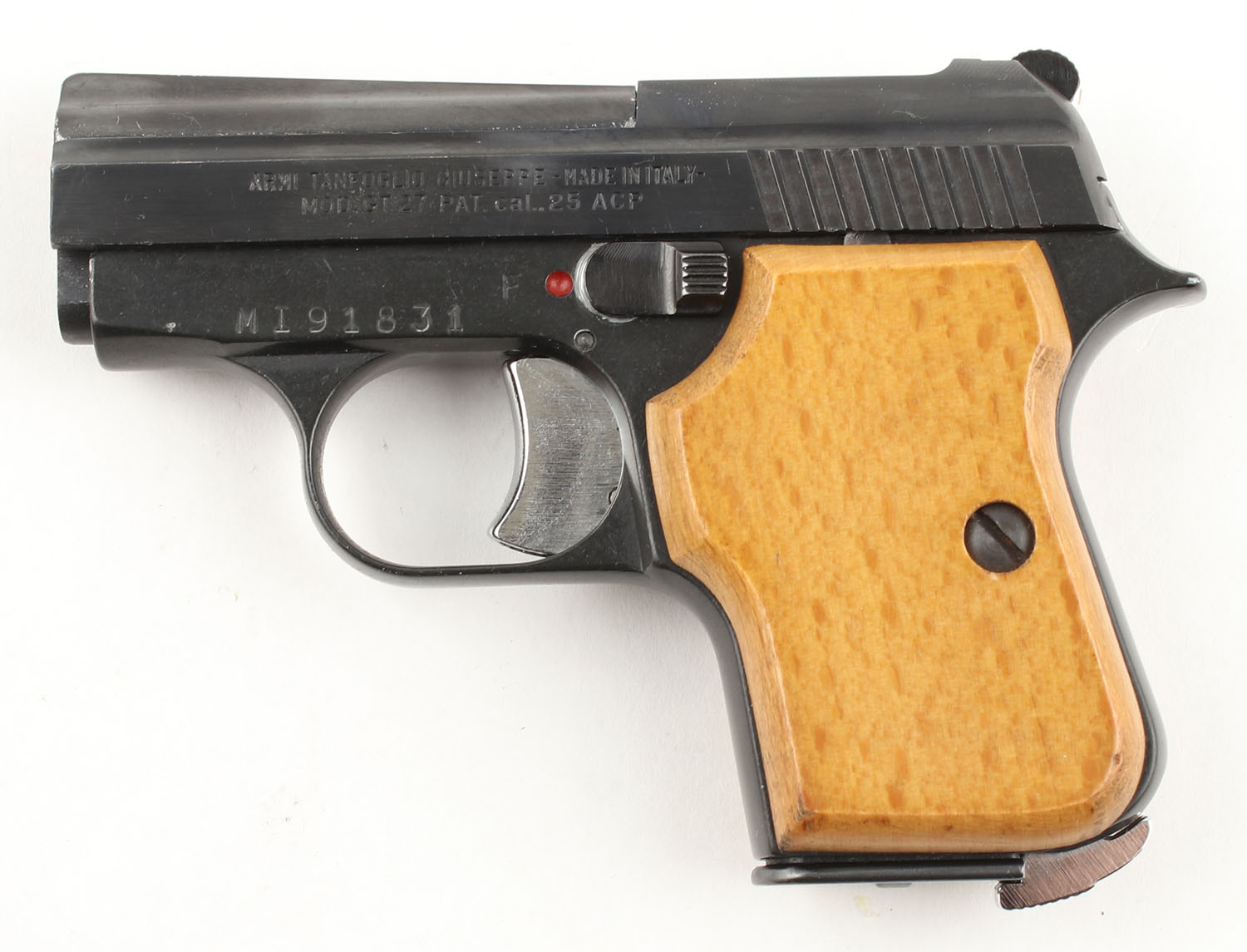 BOXED Targa (Armi Tanfoglio Giuseppe), GT27B, CAL: 25 ACP, MFG: 1962-90, SN: MI91831, Semi Auto Pistol, 2 3/8'' Barrel. The wood grips are excellent with minimal wear. The black finish on the gun is excellent with minimal wear. Bore is excellent, the bore has machining marks & thin rifling but seems to be manufactured this way. Mechanically solid, seems to function well. The slide holds a square notch rear sight & the barrel holds an integral front ramp sight. The sights are fixed with an all black sight picture. Comes in the serially matching box with a magazine & an owners manual. FFL Req. - Value: 100 to 250