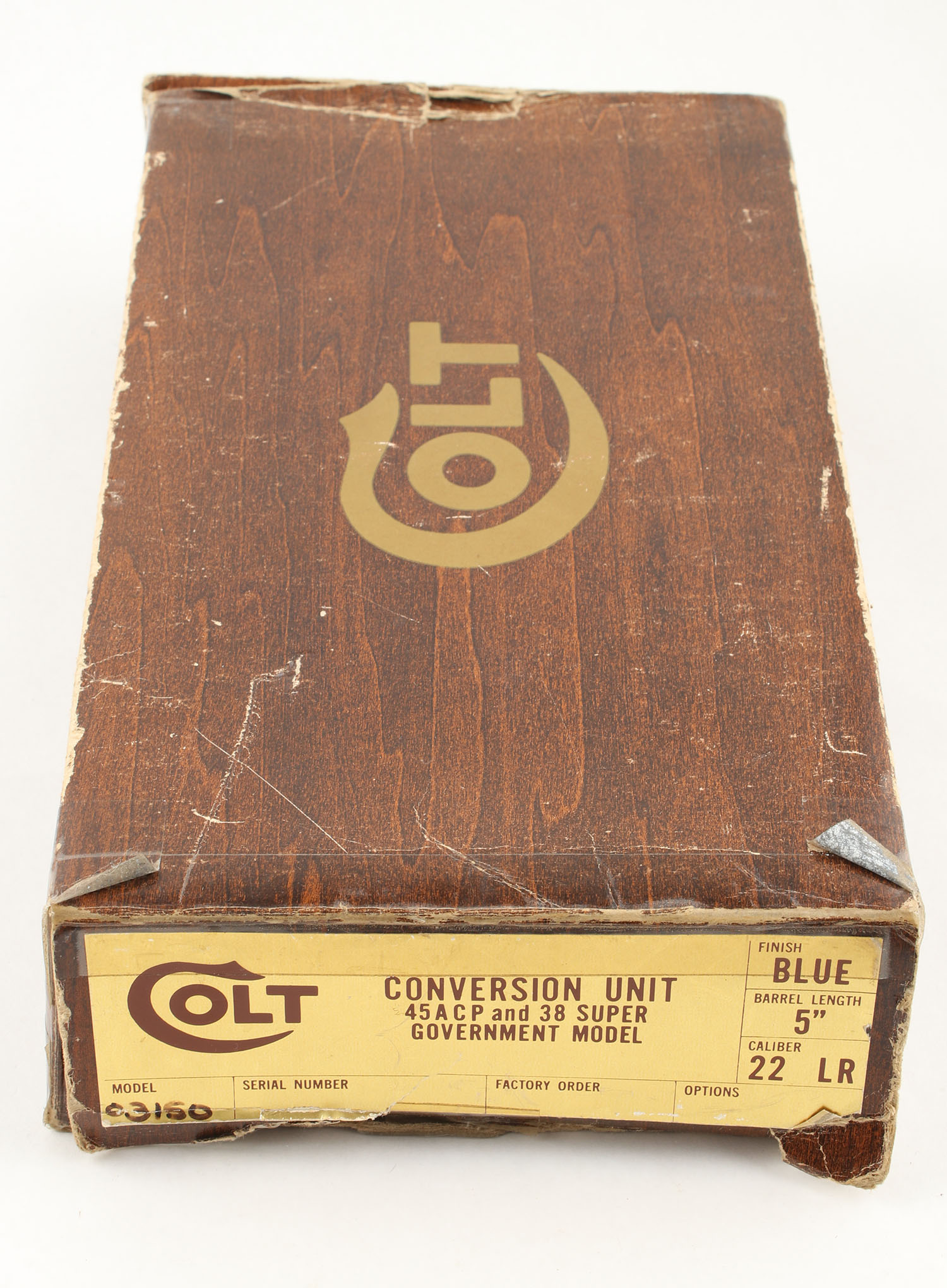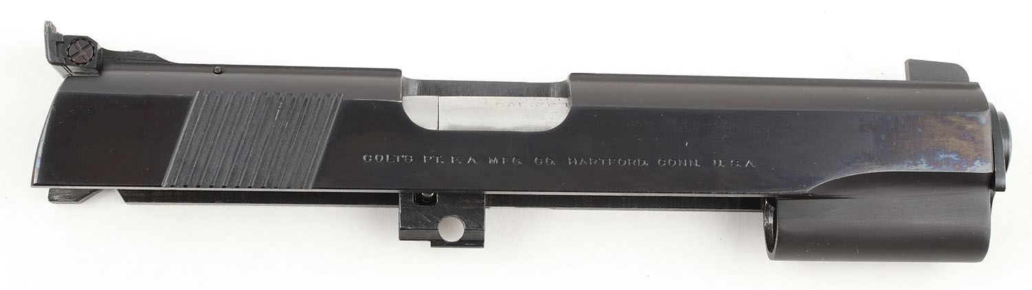 BOXED (Conversion Kit) Colt, 45 ACP & 38 Super Government Model (1911), converts firearm to 22 LR. Comes in a correct factory box with an instructions manual & all of the parts listed on the manual. The blued finish on the slide rates approximately 99% with minimal wear. Bore is excellent, bright with strong rifling. The slide holds a fixed front sight & windage & elevation adjustable rear sight. The sight picture is all black. Parts, No FFL Req. - Value: 250 to 500