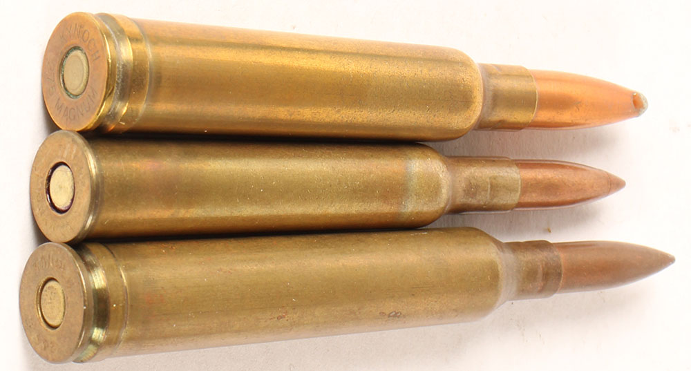 Lot of 3, British Sporting Cartridges. (1) .244 Belted Magnum, HS:''244 MAGNUM'', PT CJ copper tip. (1) .240 Flanged Magnum, HS:''KYNOCH 240'', PT CJ copper tip. (1) ..275 Flanged Magnum, HS:''KYNOCH .275 MAGNUM'', PT CJ SP. Grade Very Good - Value: 20 to 40