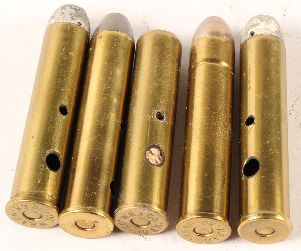 Lot of 5, American Large Caliber Sporting Cartridges. (1) .50x2.5'' Sharps. NHS. ''BLANK''. (4) .50-110 Winchester. 1--HS:''REM-UMC 50-110 HV'', FN Tinned CJ SP, 1--HS:''W.R.A. Co. 50-110 W.H.V.'', FN CJ SP, 2--HS:''W.R.A.Co. 50-110 EX'', one is HP CJ SP and the other is FN CJ FMJ. All have 2 non-factory holes in case. Grade Very Good. - Value: 40 to 150