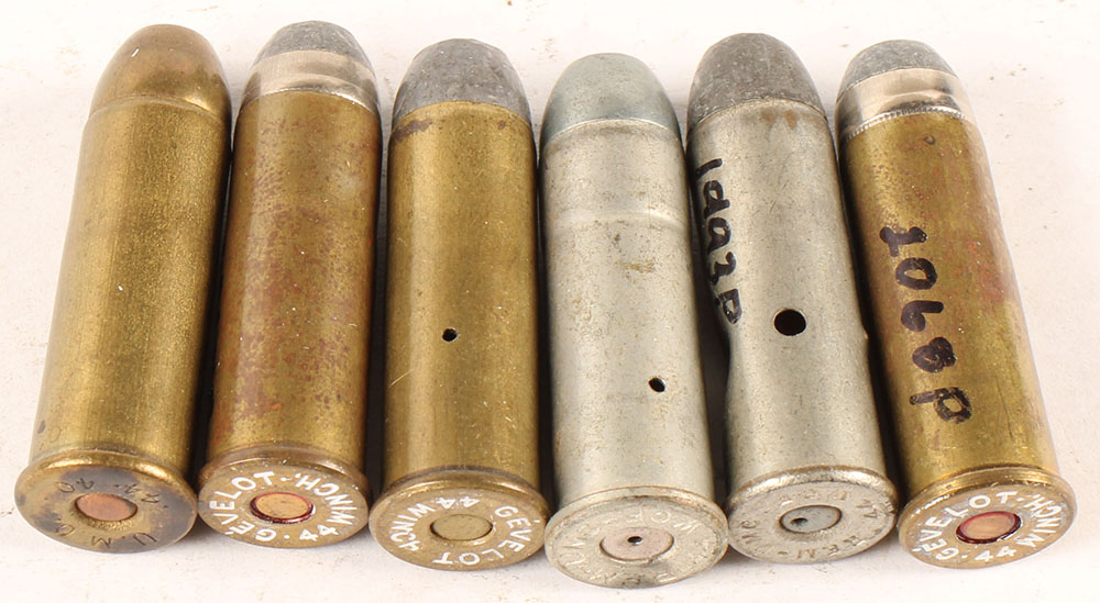 Lot of 6,44-40 Winchester Dummies. (2) HS:''REM-UMC 44 WCF'',1-- FN Lead, One small hole in tinned case and one small hole in primer. 1--4 larger holes in tinned case and one small hole in primer. (1) HS:''U.M.C. .44-40'', FN BJ FMJ, very light. (3) HS:'' GEVELOT .44 WINCH.'', 2--FN CN SP, 1--FN Lead. Grade Very Good - Value: 20 to 100