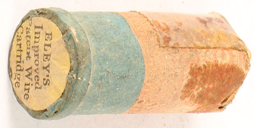 Early Eley's wire and concentrator shot loads. The Eley Brothers began designing shot in the 1820s in London and the company is still in business today and located in Birmingham. Civil Wire Paper wrapped Eley 16 gauge wire shot shell. Base of the cartridge is marked: 16 Gauge Bottom on an orange tag. Grade: Excellent - Value: 10 to 50