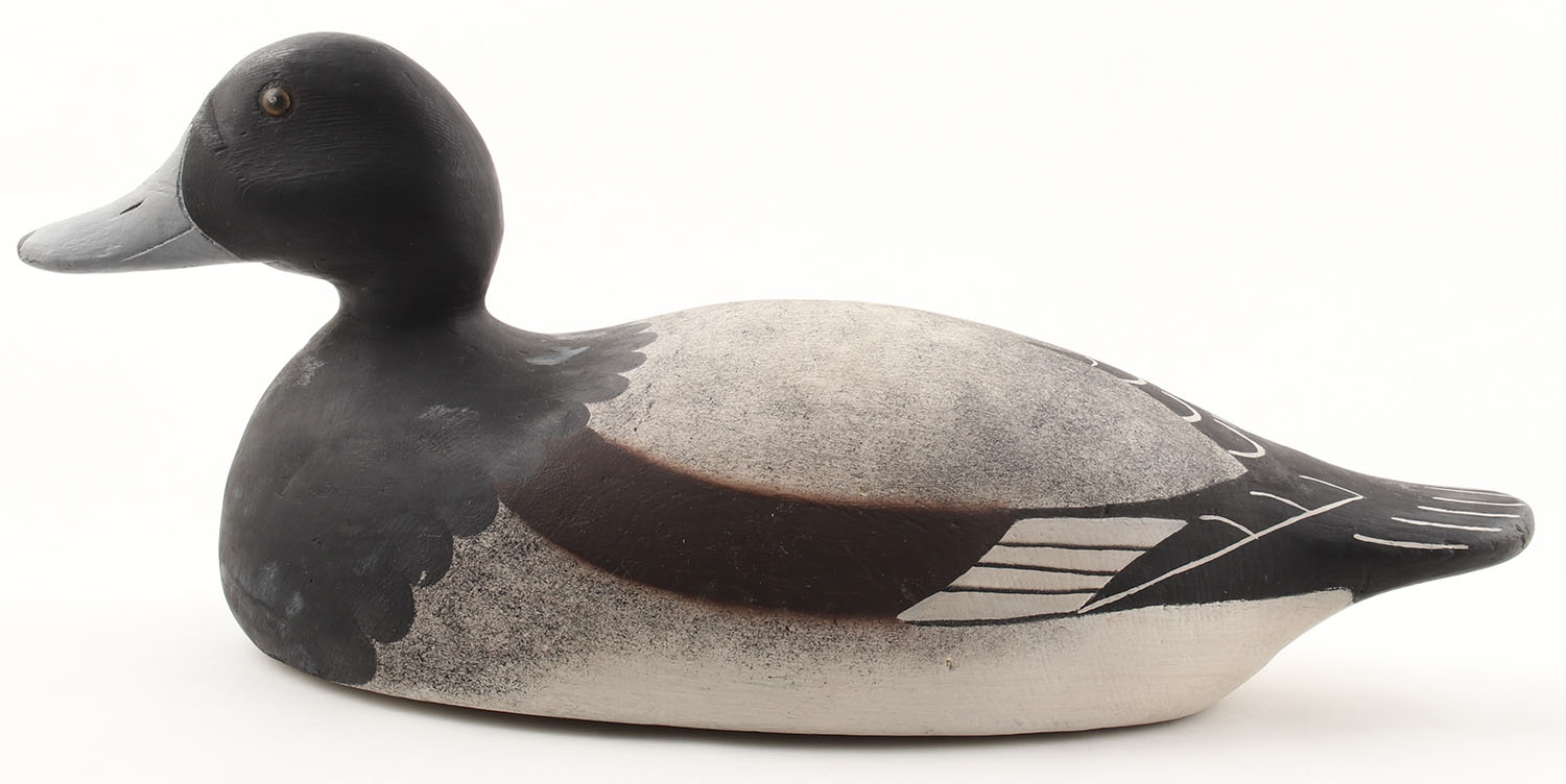 Bluebill Drake by Unknown Maker, glass eyes, solid wood, repaint?, structurally excellent, 18'' OAL. Grade: Excellent - Value: 50 to 100
