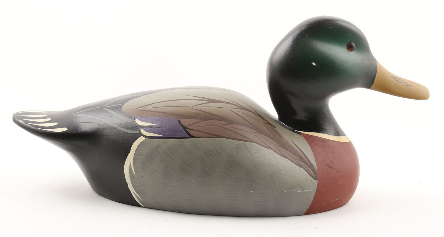 Mallard Drake by Shirley Hearne, Stoney Point Decoys, 1992, #53524, glass eyes, solid wood, original paint, signed on bottom, has Stoney Point coin, 14 1/2'' OAL. Grade: Excellent - Value: 30 to 60