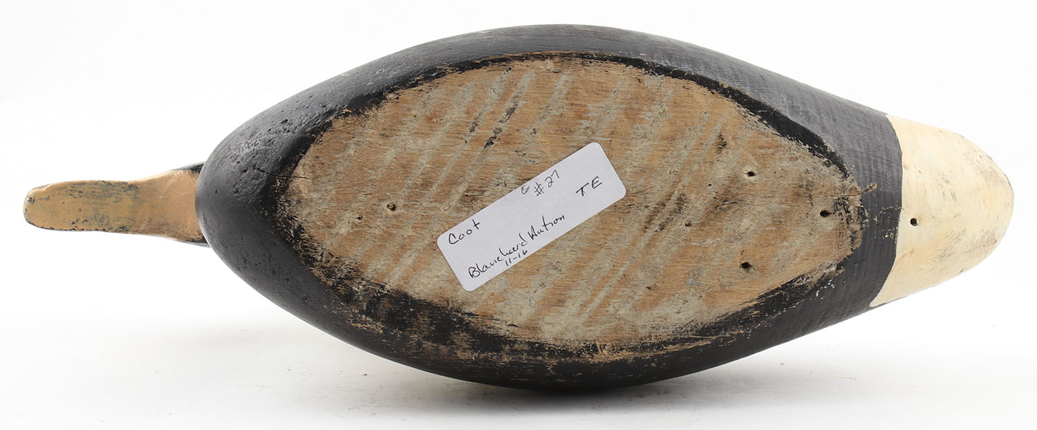 Coot by Unknown Maker, glass eyes (broken), solid wood, original paint, cracked neck, otherwise structurally sound, 16 1/2'' OAL. Grade: Good + - Value: 20 to 40