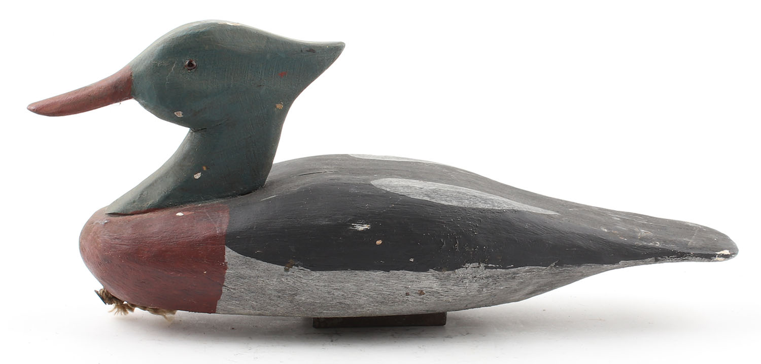 Red Breasted Merganser by Romie Waterfield, Crisfield, MD, glass eyes, solid wood, original paint, structurally excellent, 15 1/2'' OAL. Grade: Very Good - Value: 30 to 60