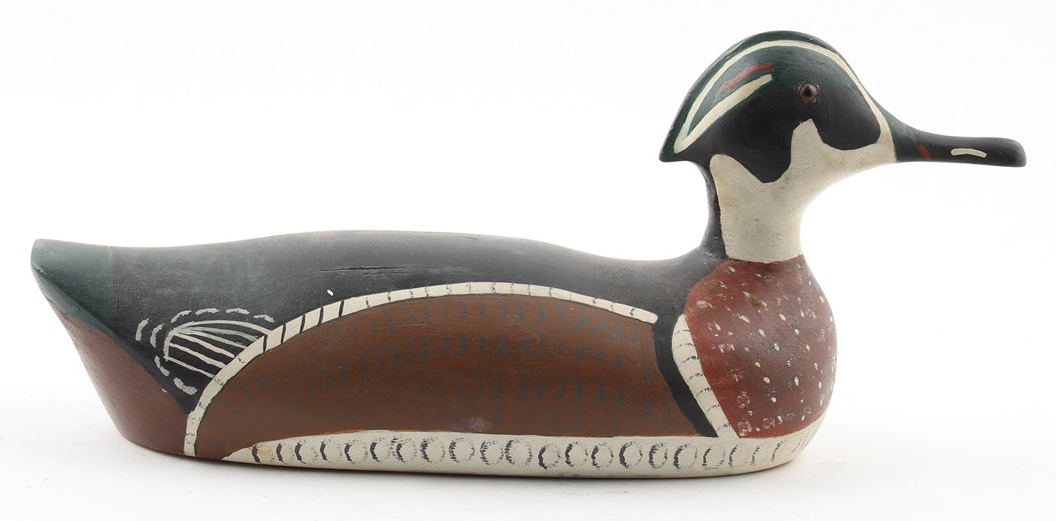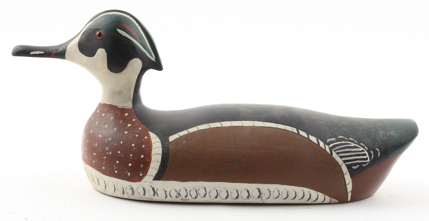 Woodduck Drake by Paul Perkins, 1991, glass eyes, solid wood, original paint, structurally excellent, 13'' OAL. Grade: Excellent - Value: 30 to 60